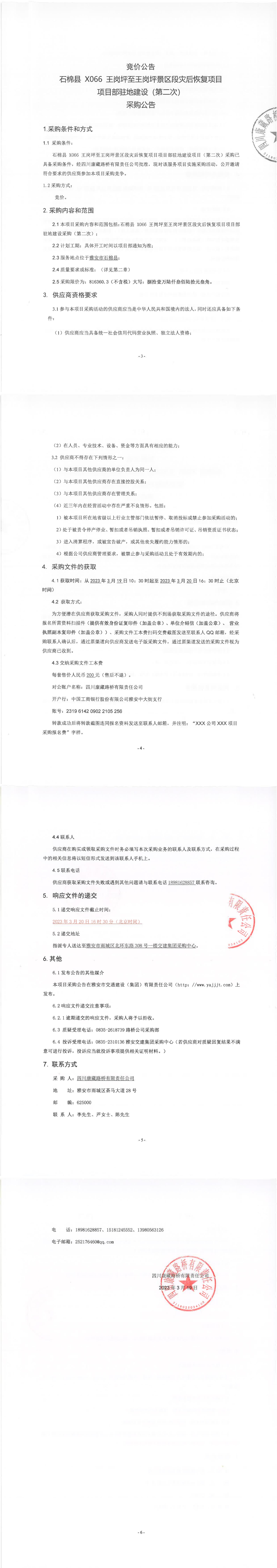 四川康藏路橋有限責任公司石棉縣X066王崗坪至王崗坪景區(qū)段災后恢復項目項目部駐地建設(第二次)采購公告