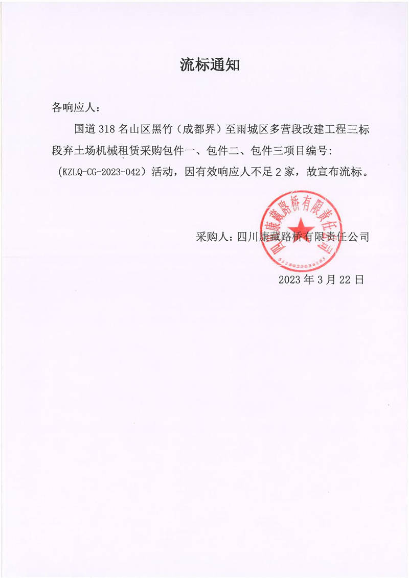 四川康藏路橋有限責(zé)任公司國道318名山區(qū)黑竹(成都界)至雨城區(qū)多營段改建工程三標(biāo)段棄土場機(jī)械租賃采購流標(biāo)通知