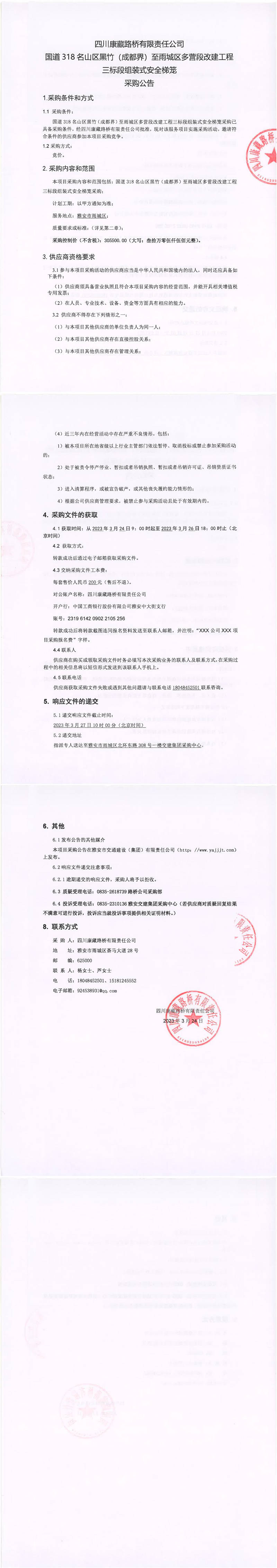 四川康藏路橋有限責(zé)任公司國道318名山區(qū)黑竹(成都界)至雨城區(qū)多營段改建工程三標(biāo)段組裝式安全梯籠采購公告