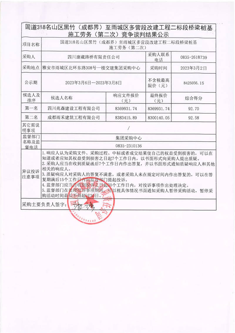 四川康藏路橋有限責任公司國道318名山區(qū)黑竹(成都界)至雨城區(qū)多營段改建工程二標段橋梁樁基施工勞務(第二次)競爭談判結(jié)果公示