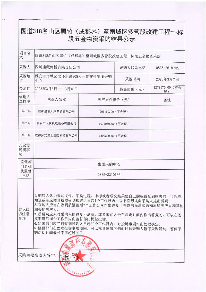 四川康藏路橋有限責任公司國道318名山區(qū)黑竹(成都界)至雨城區(qū)多營段改建工程一標段五金物資采購結果公示