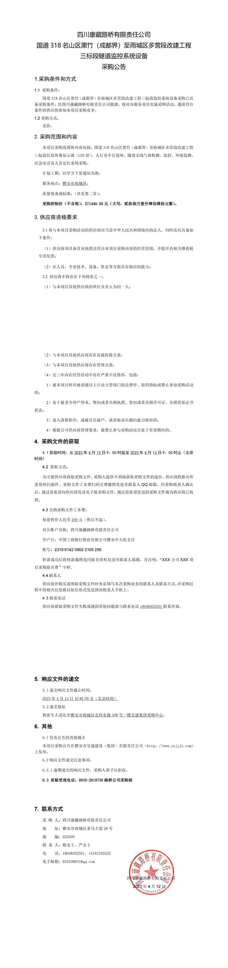 四川康藏路橋有限責任公司國道318名山區(qū)黑竹(成都界)至雨城區(qū)多營段改建工程三標段隧道監(jiān)控系統(tǒng)設備采購公告