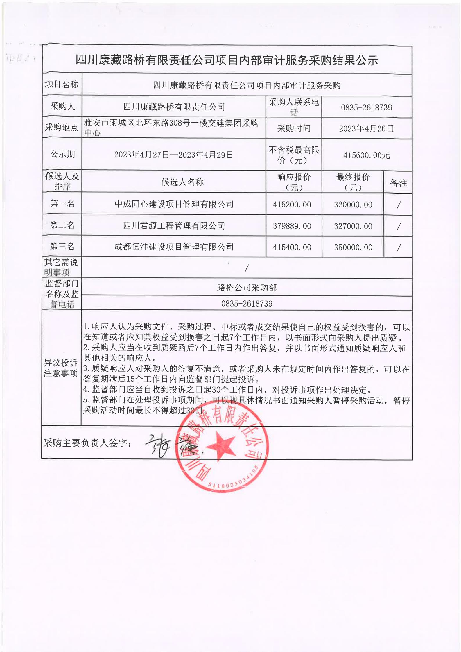四川康藏路橋有限責任公司項目內(nèi)部審計服務采購結(jié)果公示