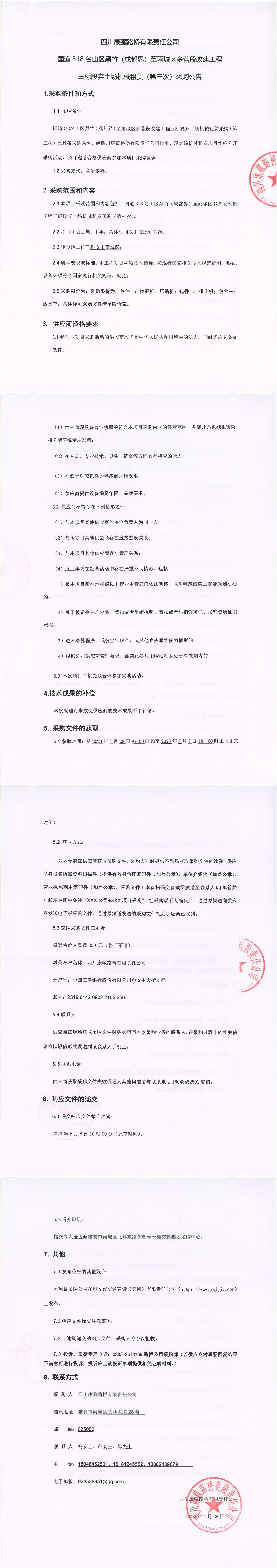 四川康藏路橋有限責(zé)任公司國道318名山區(qū)黑竹(成都界)至雨城區(qū)多營段改建工程三標(biāo)段棄土場機(jī)械租賃(第三次)采購公告