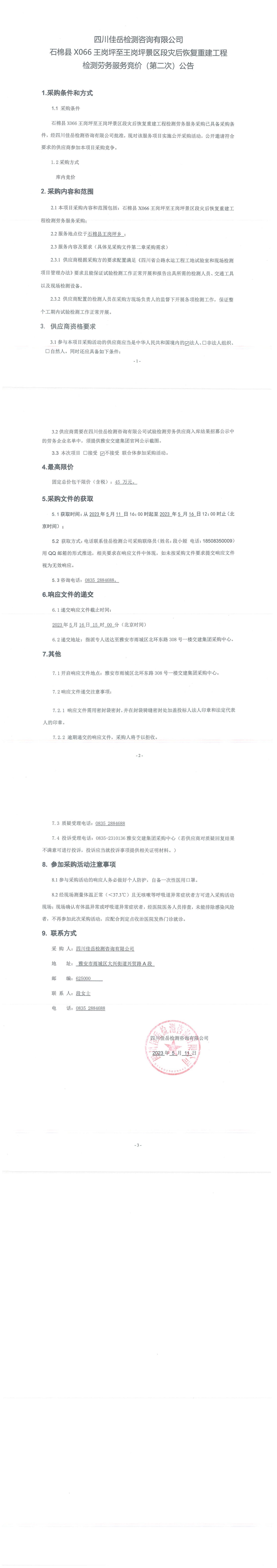 四川佳岳檢測咨詢有限公司石棉縣X066王崗坪至王崗坪景區(qū)段災后恢復重建工程檢測勞務服務競價(第二次)采購公告