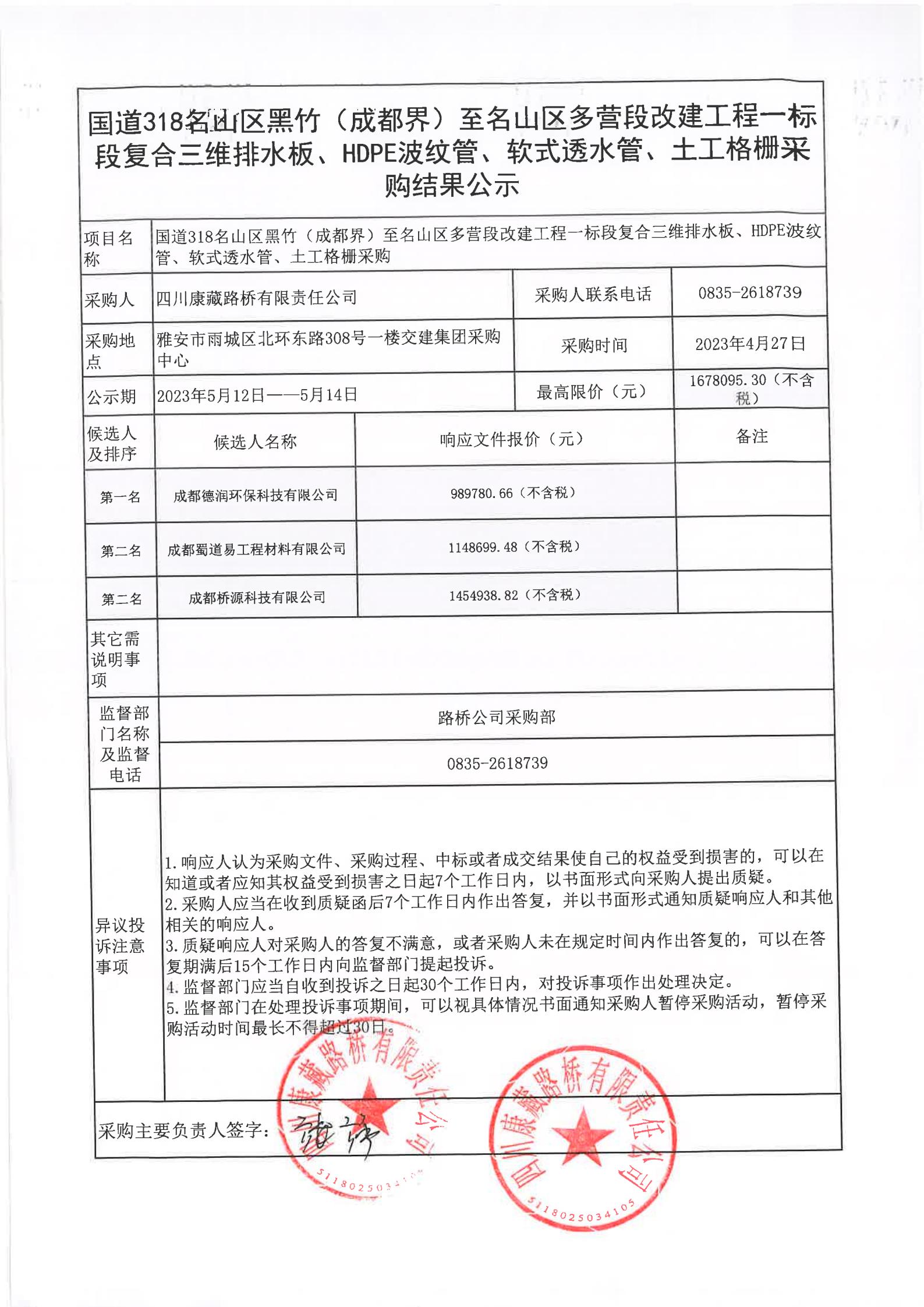 四川康藏路橋有限責任公司國道318名山區(qū)黑竹(成都界)至雨城區(qū)多營段改建工程一標段復(fù)合三維排水板、HDPE波紋管、軟式透水管、土工格柵采購結(jié)果公示