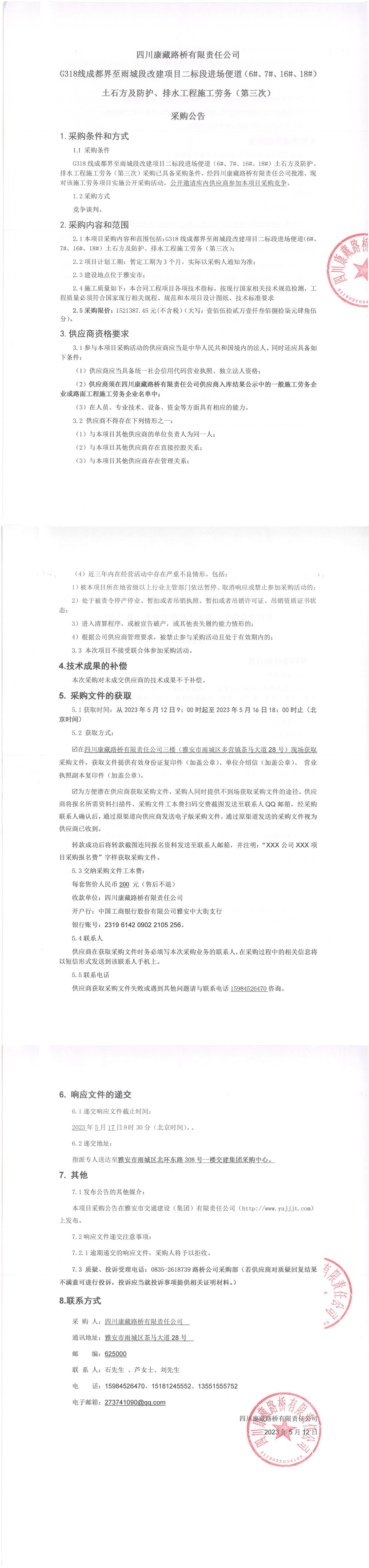 四川康藏路橋有限責(zé)任公司G318線(xiàn)成都至雨城段改建項(xiàng)目二標(biāo)段進(jìn)場(chǎng)便道(6#、7#、16#、18#)土石方及防護(hù)、排水工程施工勞務(wù)(第三次)采購(gòu)公告