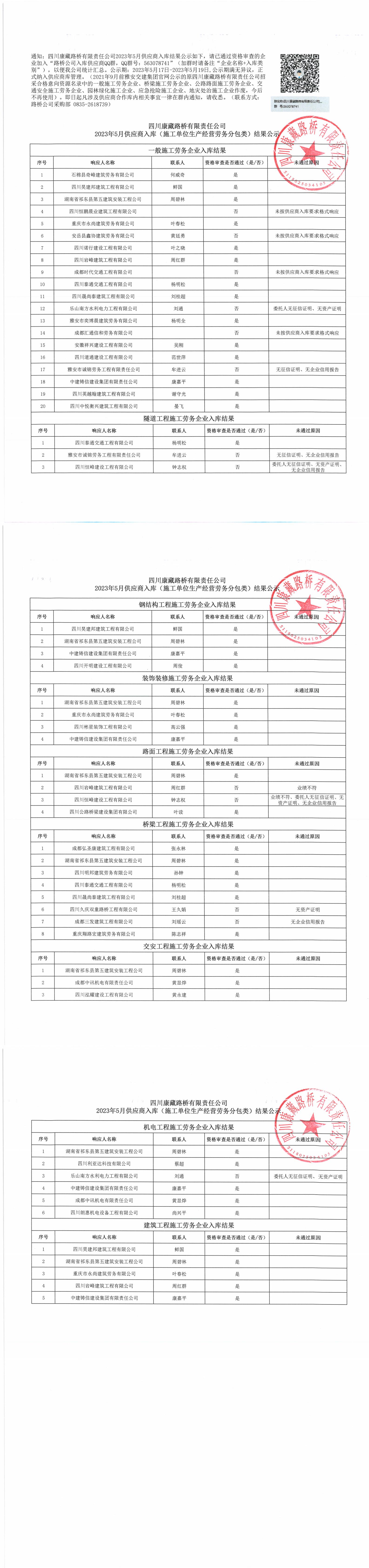 四川康藏路橋有限責任公司2023年5月供應商入庫(施工單位生產經(jīng)營勞務分包類)結果公示