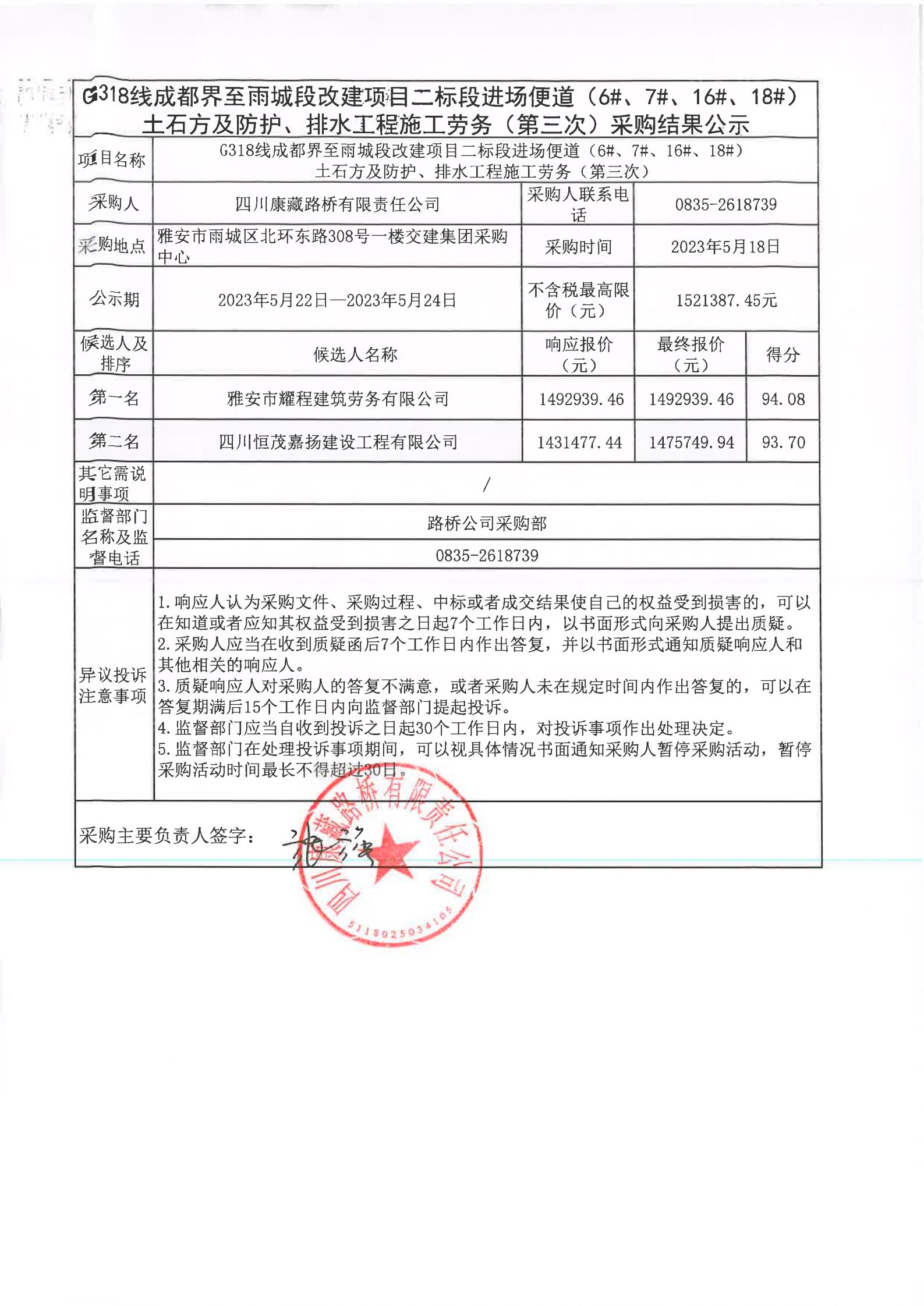 四川康藏路橋有限責(zé)任公司G318線成都至雨城段改建項(xiàng)目二標(biāo)段進(jìn)場(chǎng)便道(6#、7#、16#、18#)土石方及防護(hù)、排水工程施工勞務(wù)(第三次)采購(gòu)結(jié)果公示