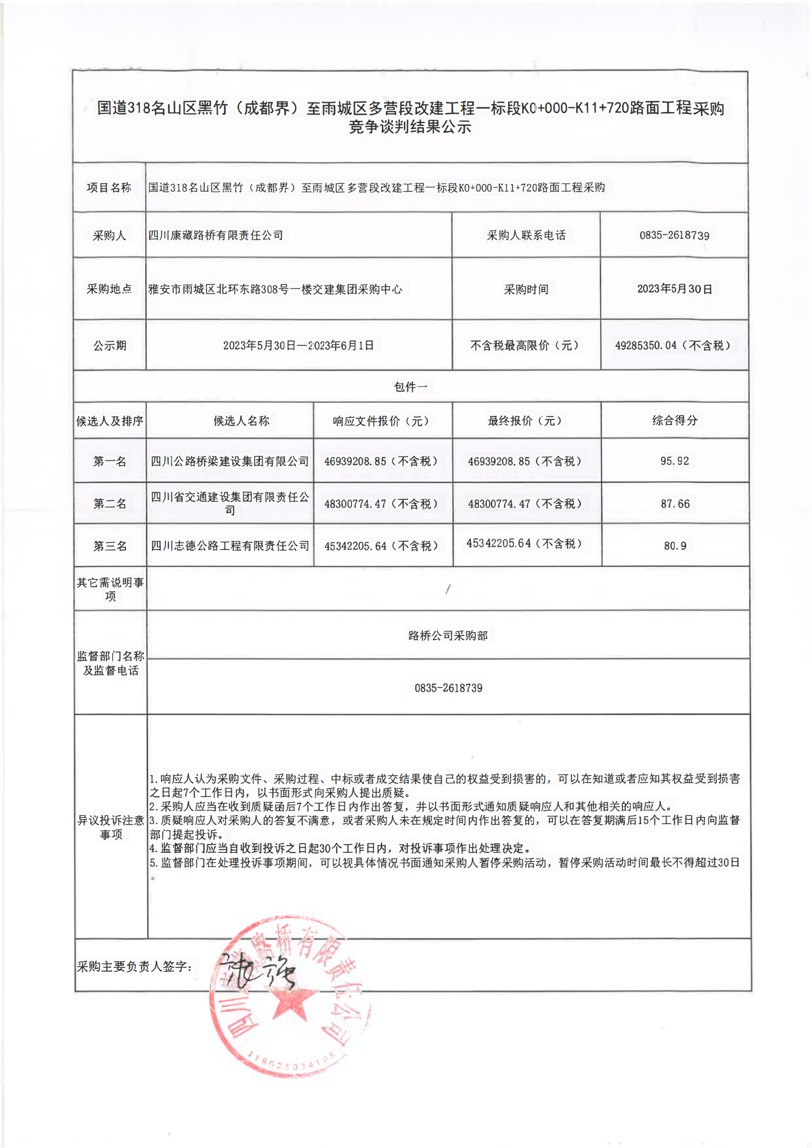 四川康藏路橋有限責任公司國道318名山區(qū)黑竹(成都界)至雨城區(qū)多營段改建工程一標段K0+000-K11+720路面工程采購競爭談判結果公示