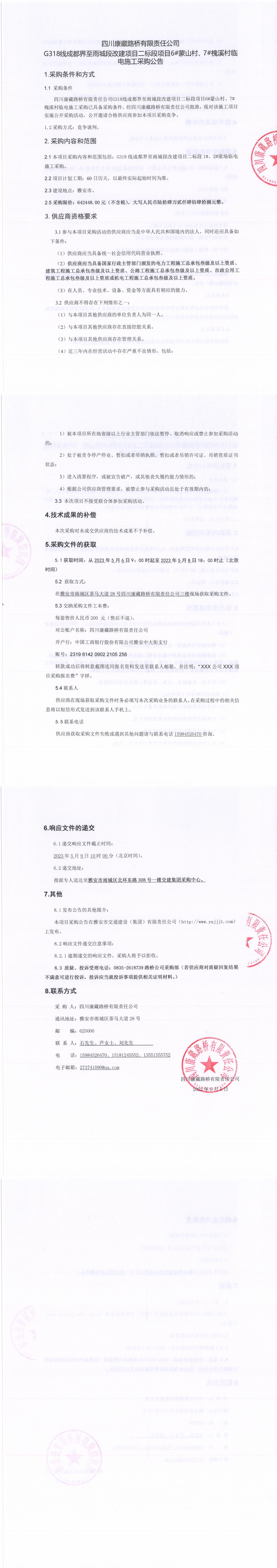四川康藏路橋有限責(zé)任公司G318線成都至雨城段改建項(xiàng)目二標(biāo)段項(xiàng)目6#蒙山村、7#槐溪村臨時(shí)電施工采購(gòu)公告