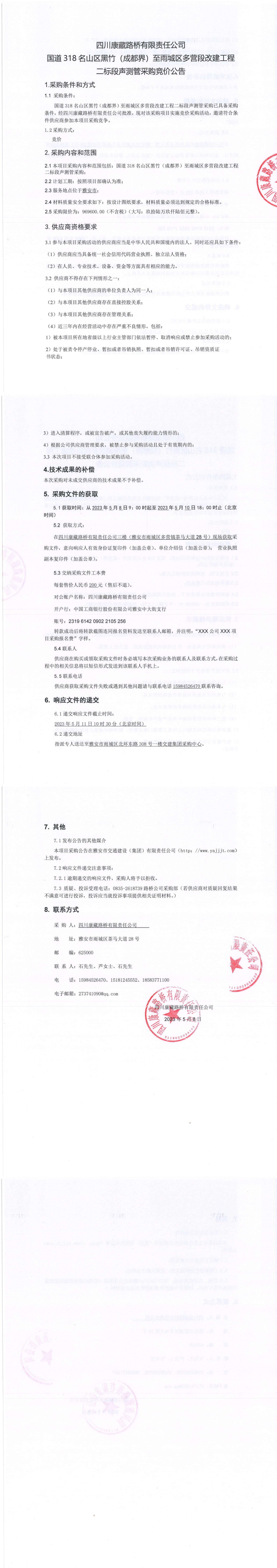 四川康藏路橋有限責(zé)任公司國道318名山區(qū)黑竹(成都界)至雨城區(qū)多營段改建工程二標段聲測管采購競價公告
