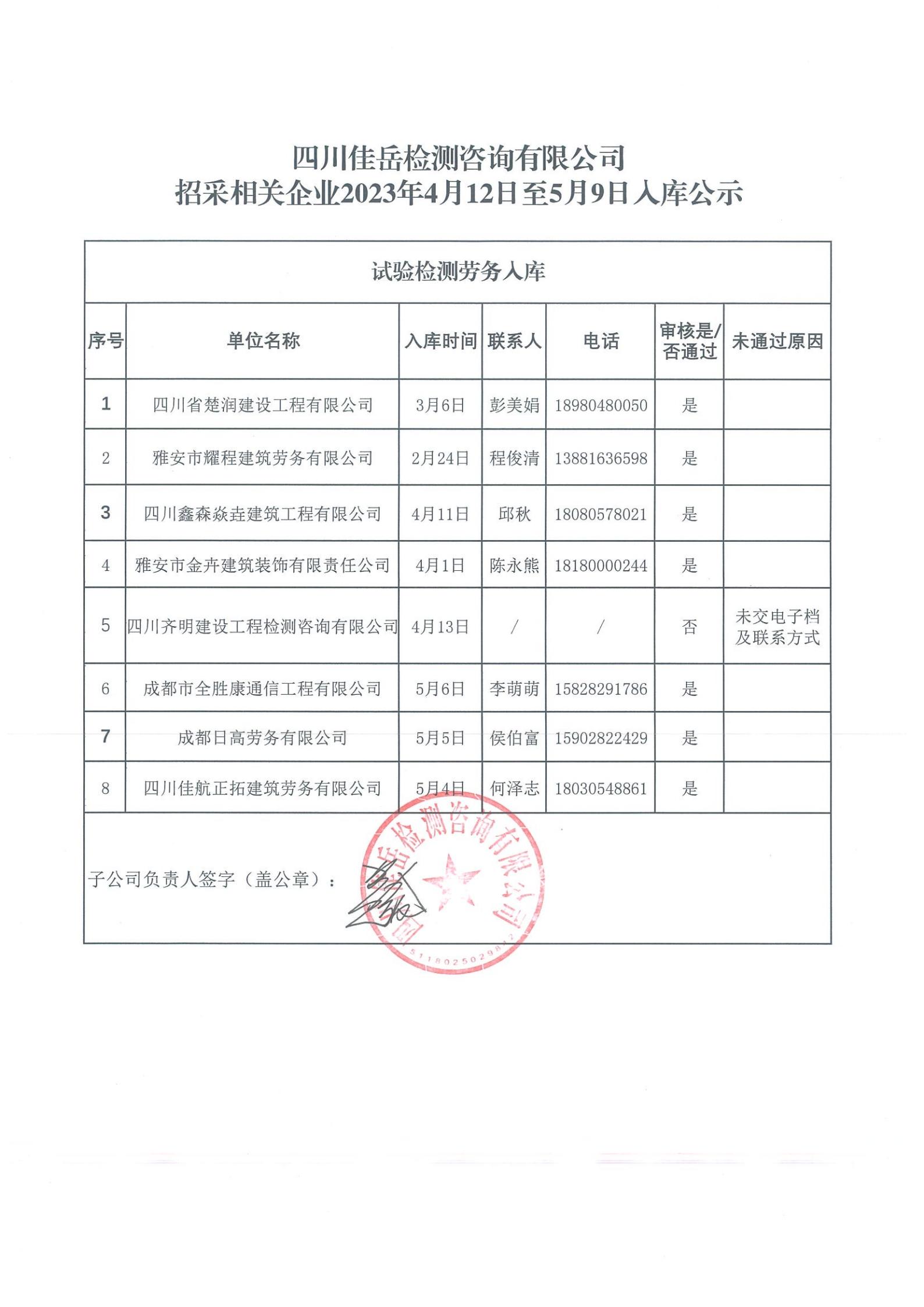 四川佳岳檢測(cè)咨詢有限公司(試驗(yàn)檢測(cè)勞務(wù)供應(yīng)商庫)2023年4月12日至5月9日入庫結(jié)果公示
