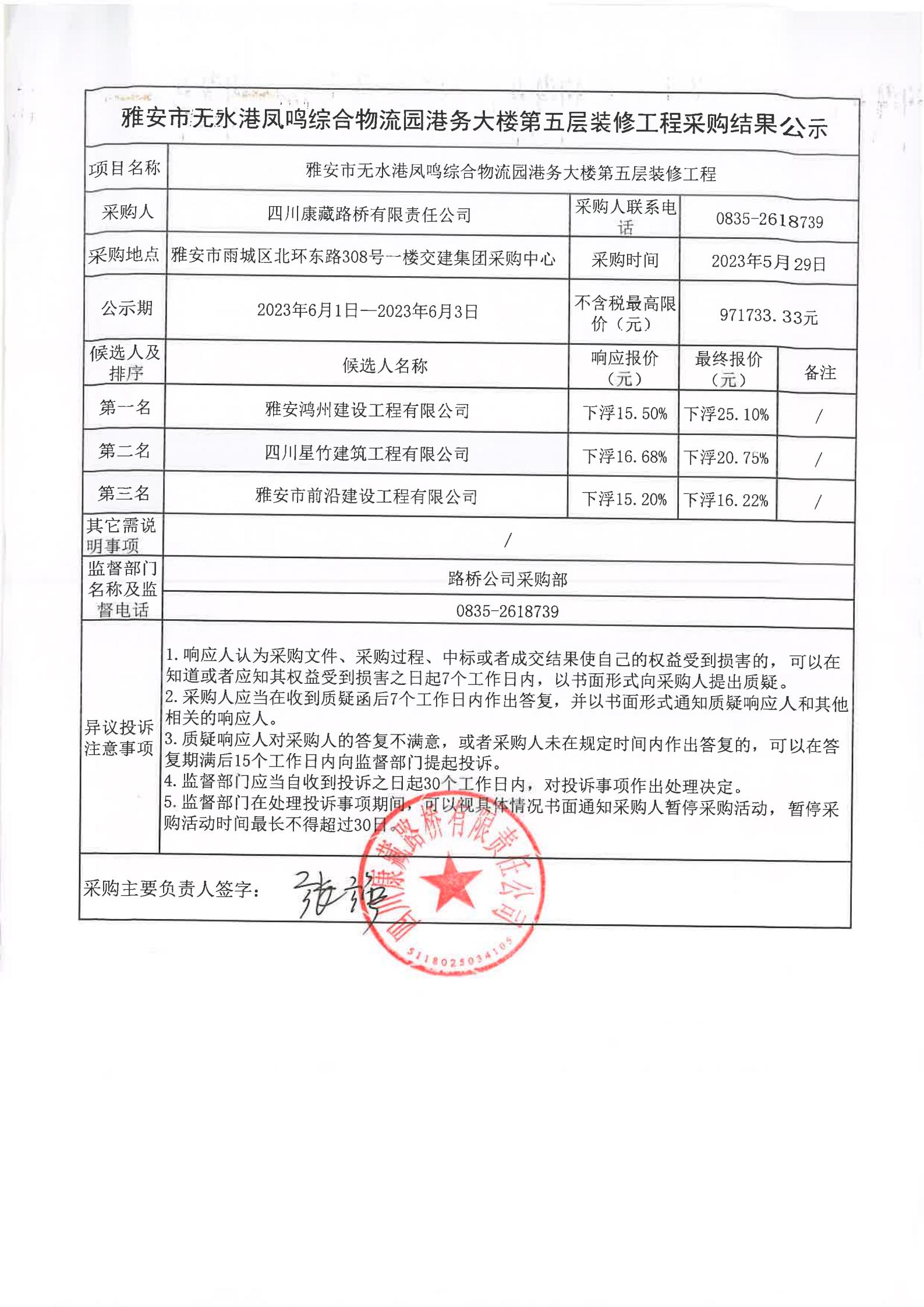 四川康藏路橋有限責(zé)任公司雅安市無水港鳳鳴綜合物流園港務(wù)大樓第五層裝修工程采購結(jié)果公示