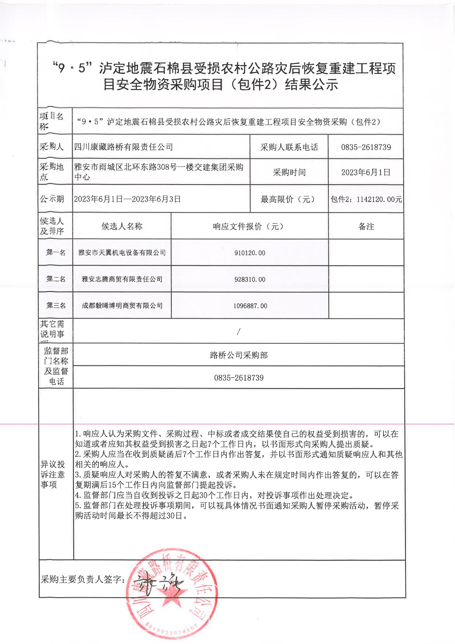 四川康藏路橋有限責任公司“9·5”瀘定地震石棉縣受損農(nóng)村公路災后恢復重建工程項目安全物資項目(包件2)結果公示