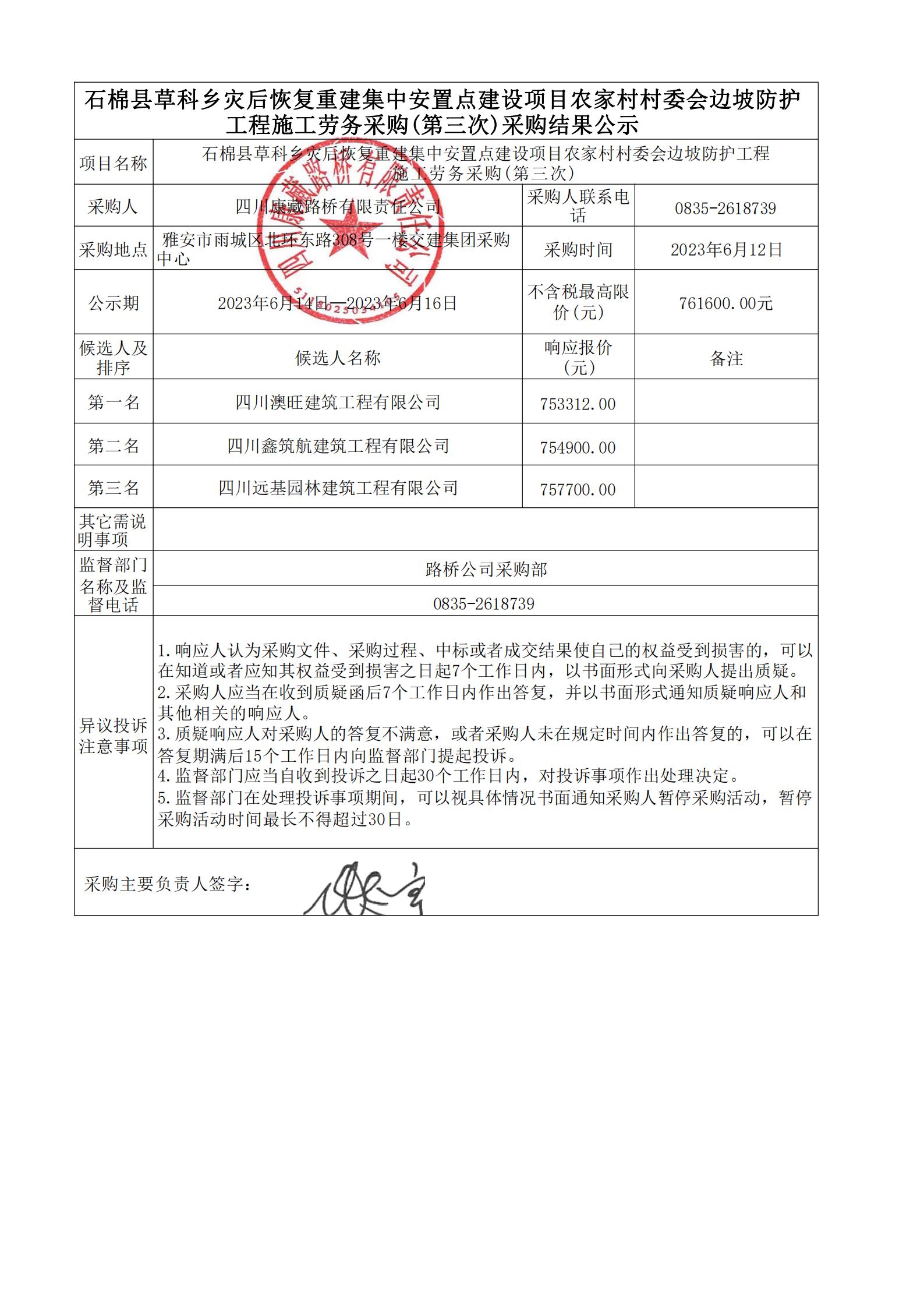 四川康藏路橋有限責任公司石棉縣草科鄉(xiāng)災后恢復重建集中安置點建設項目農家村村委會邊坡防護工程施工勞務采購(第三次)結果公示