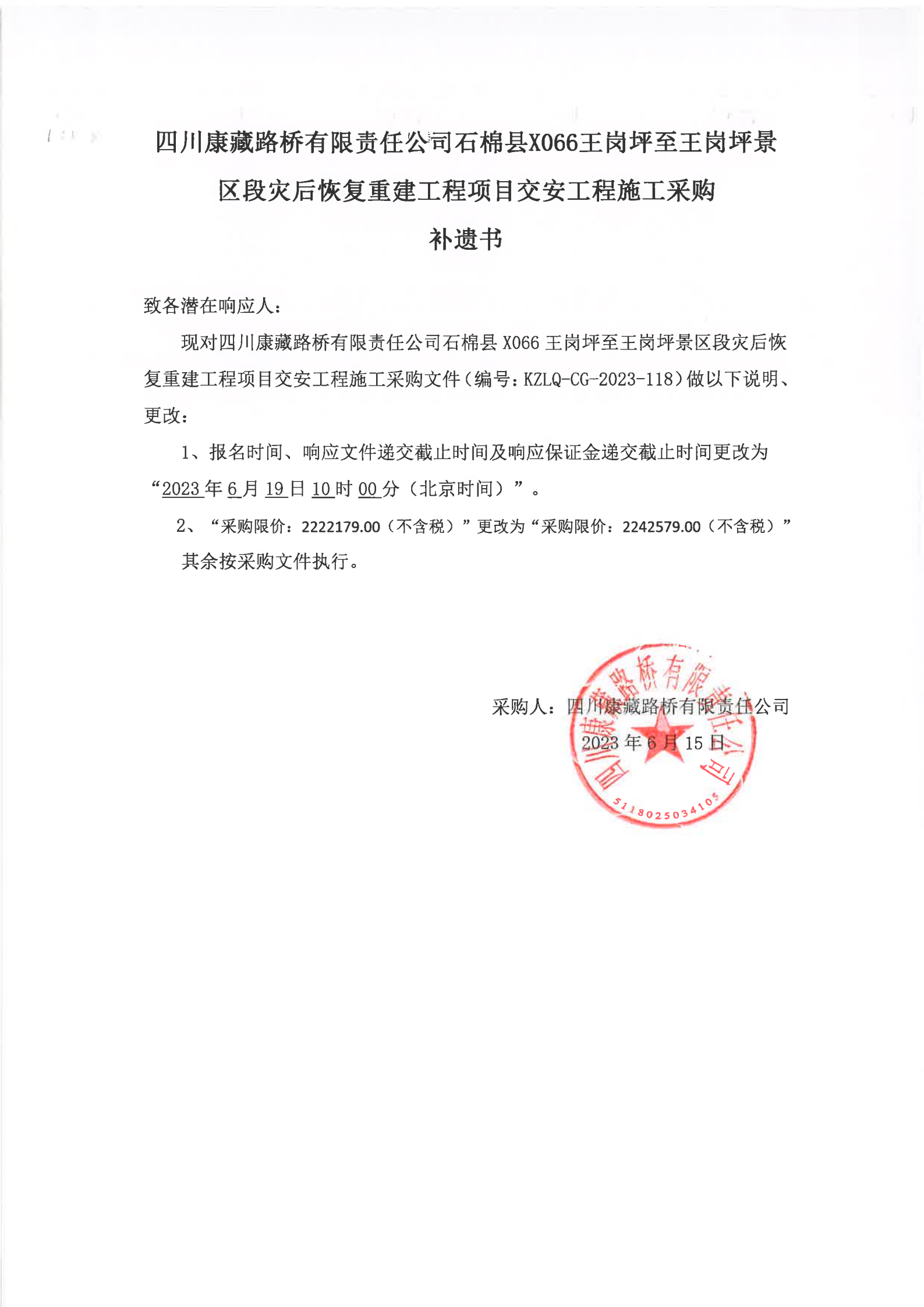 四川康藏路橋有限責任公司石棉縣X066王崗坪至王崗坪景區(qū)段災后恢復重建工程項目交安工程施工補遺書
