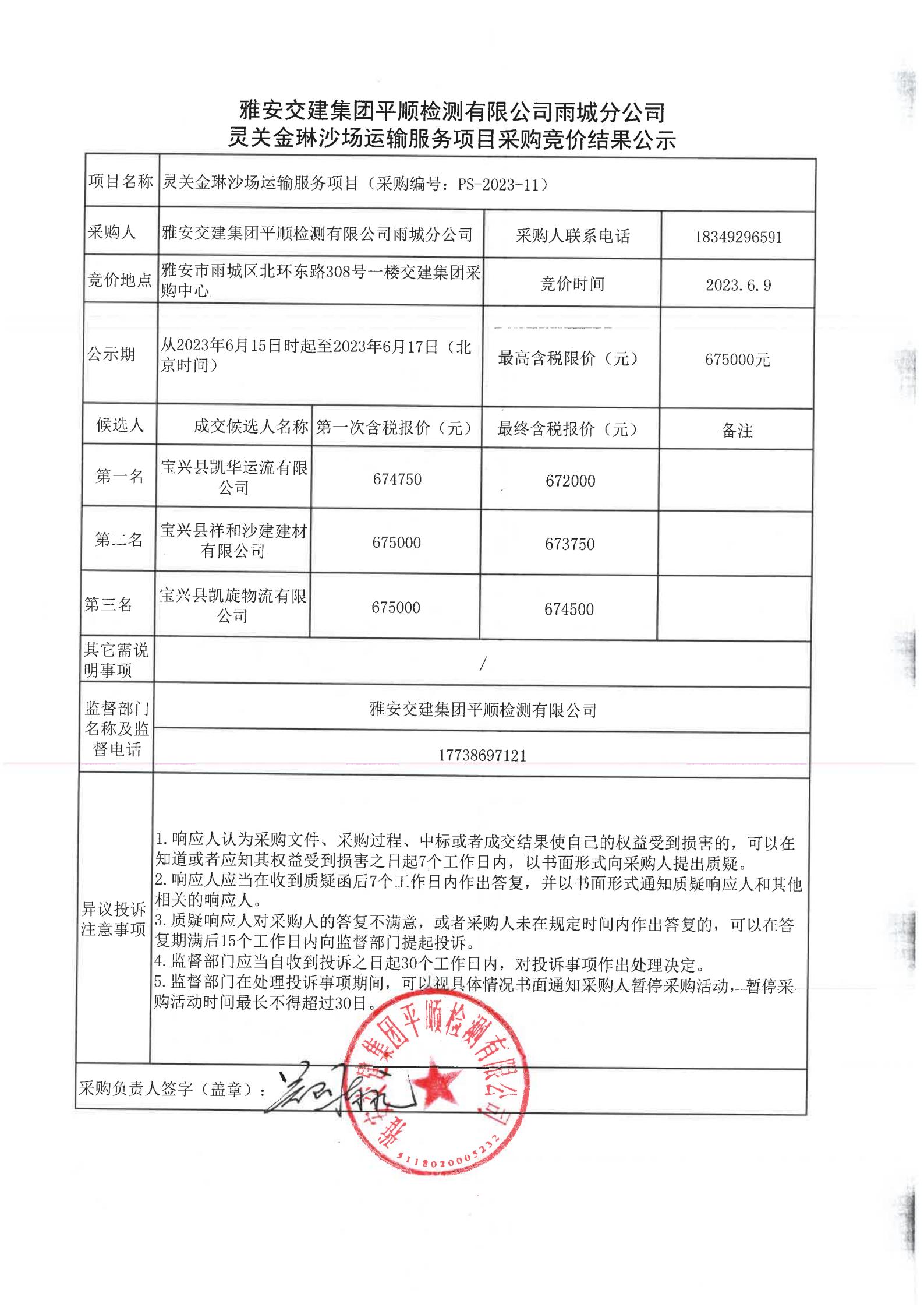 雅安交建集團平順檢測有限公司雨城分公司靈關金琳沙場運輸服務競價結(jié)果公示