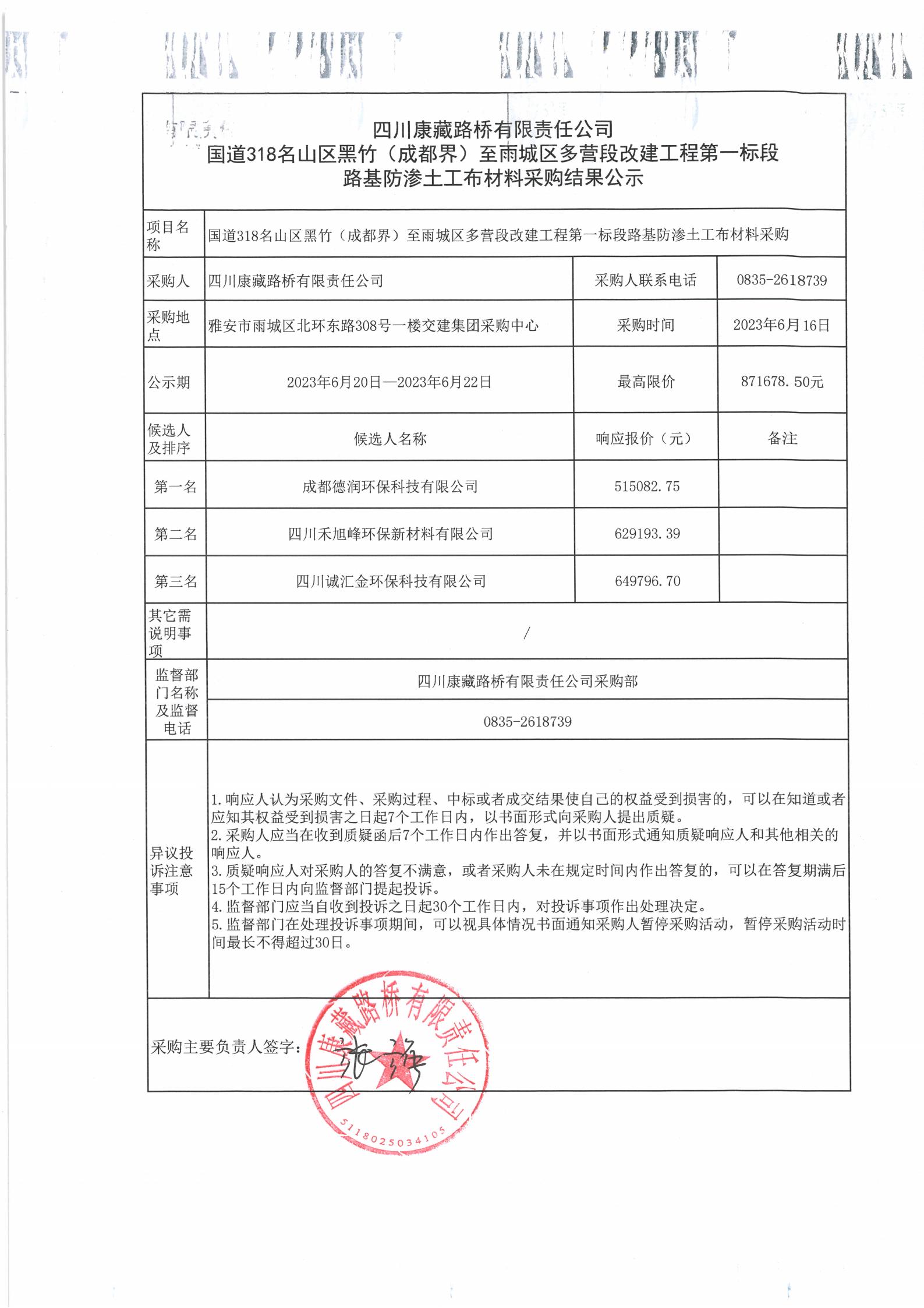 四川康藏路橋有限責(zé)任公司國道318名山區(qū)黑竹(成都界)至雨城區(qū)多營段改建工程第一標(biāo)段路基防滲土工布材料采購結(jié)果公示