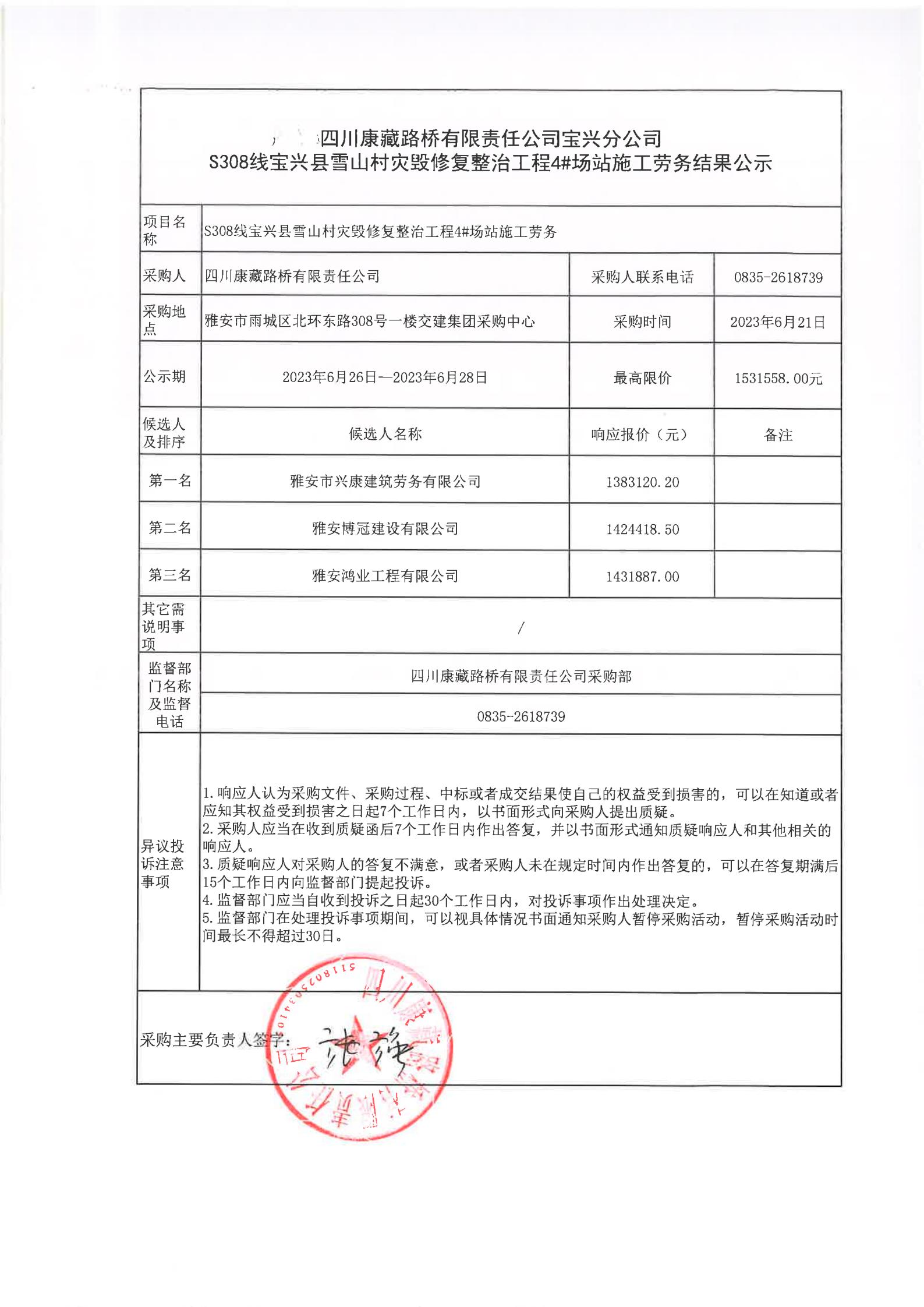 四川康藏路橋有限責(zé)任公司寶興分公司S308線寶興縣雪山村段災(zāi)毀修復(fù)整治工程4#場(chǎng)站施工勞務(wù)結(jié)果公示