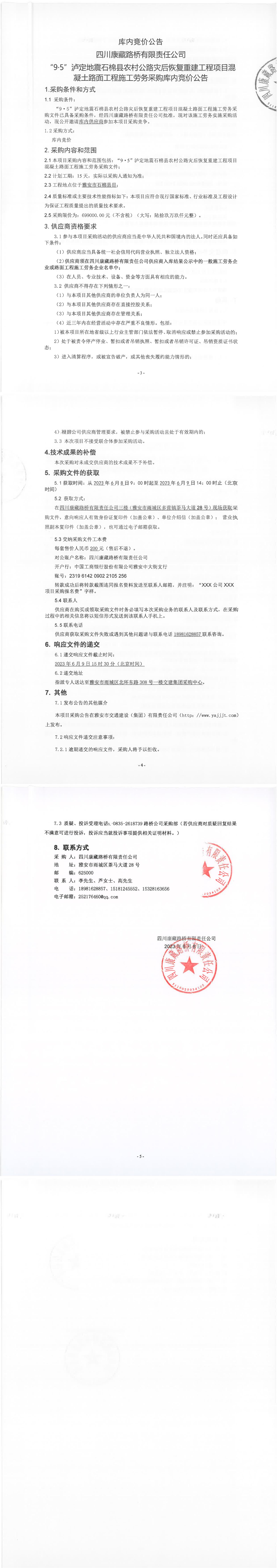 四川康藏路橋有限責任公司“9·5”瀘定地震石棉縣農(nóng)村公路災后恢復重建工程項目混凝土路面工程施工勞務采購庫內(nèi)競價公告