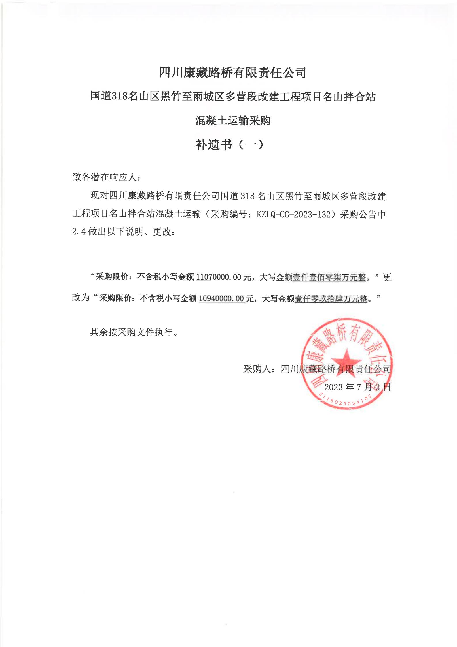 四川康藏路橋有限責任公司國道318名山區(qū)黑竹至雨城區(qū)多營段改建工程項目名山拌合站混凝土運輸服務采購補遺書