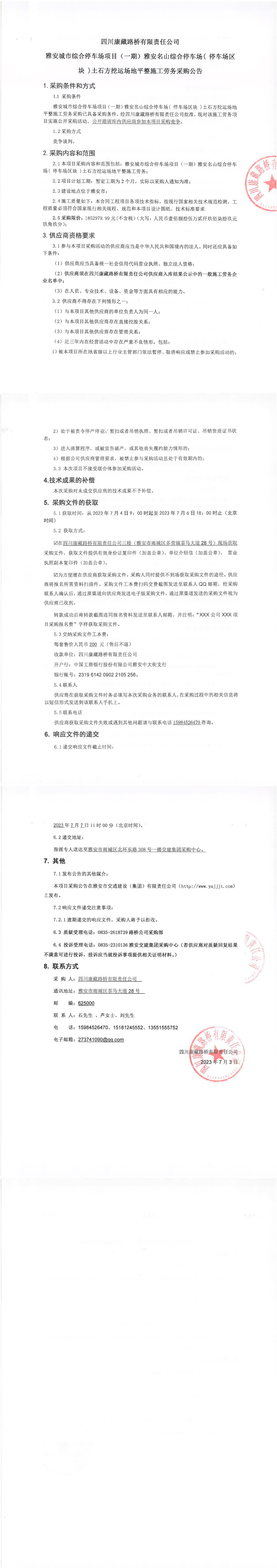 四川康藏路橋有限責(zé)任公司雅安城市綜合停車場(chǎng)項(xiàng)目(一期)雅安名山綜合停車場(chǎng)(停車場(chǎng)區(qū)塊)土石方挖運(yùn)場(chǎng)地平整施工勞務(wù)采購(gòu)公告