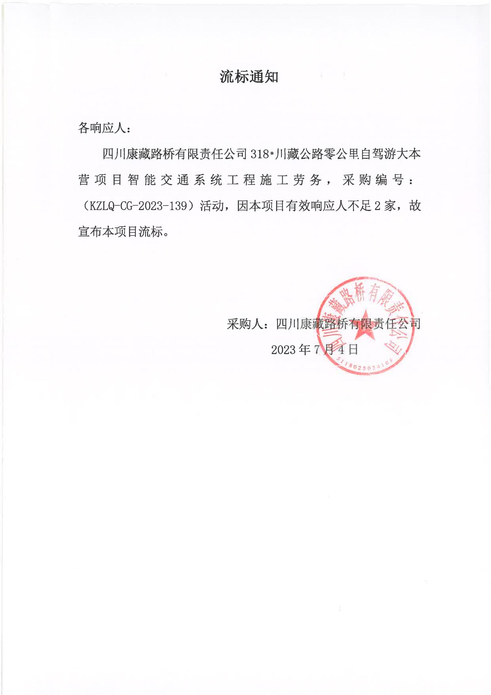 四川康藏路橋有限責(zé)任公司318·川藏公路零公里自駕游大本營(yíng)項(xiàng)目智能交通系統(tǒng)工程施工勞務(wù)流標(biāo)通知
