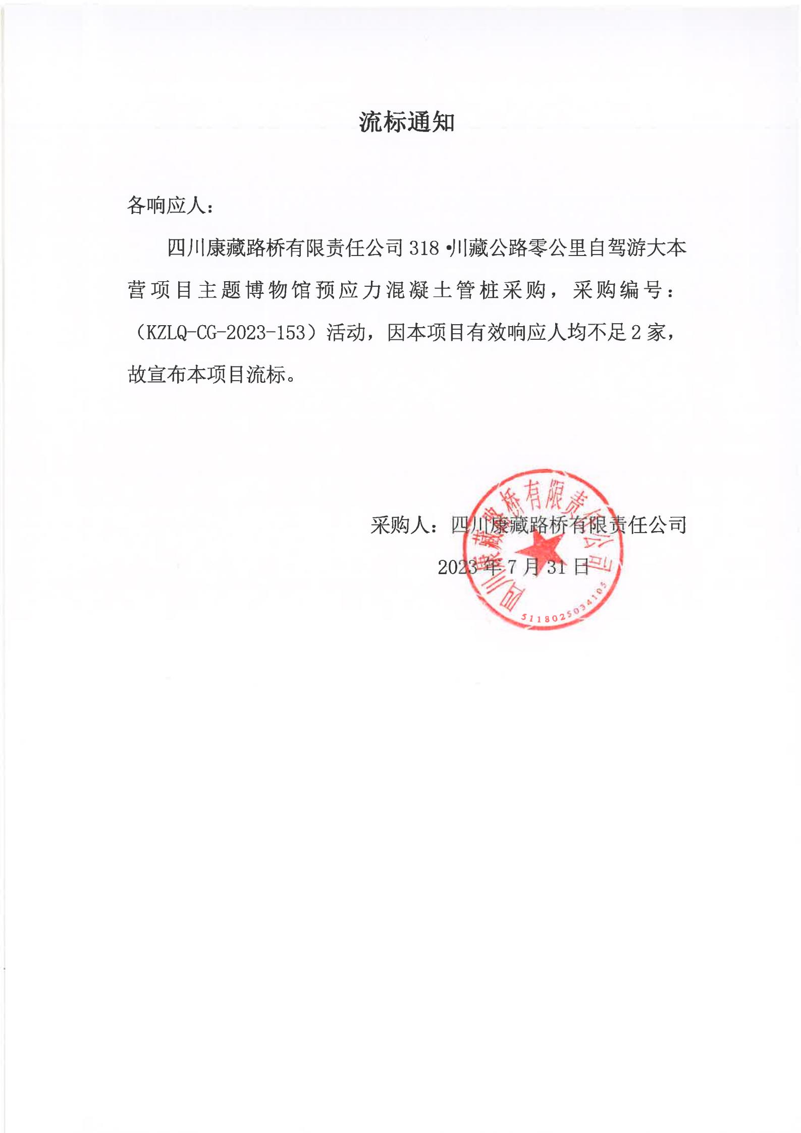 四川康藏路橋有限責(zé)任公司318·川藏公路零公里自駕游大本營項(xiàng)目主題博物館預(yù)應(yīng)力混凝土管樁采購流標(biāo)通知