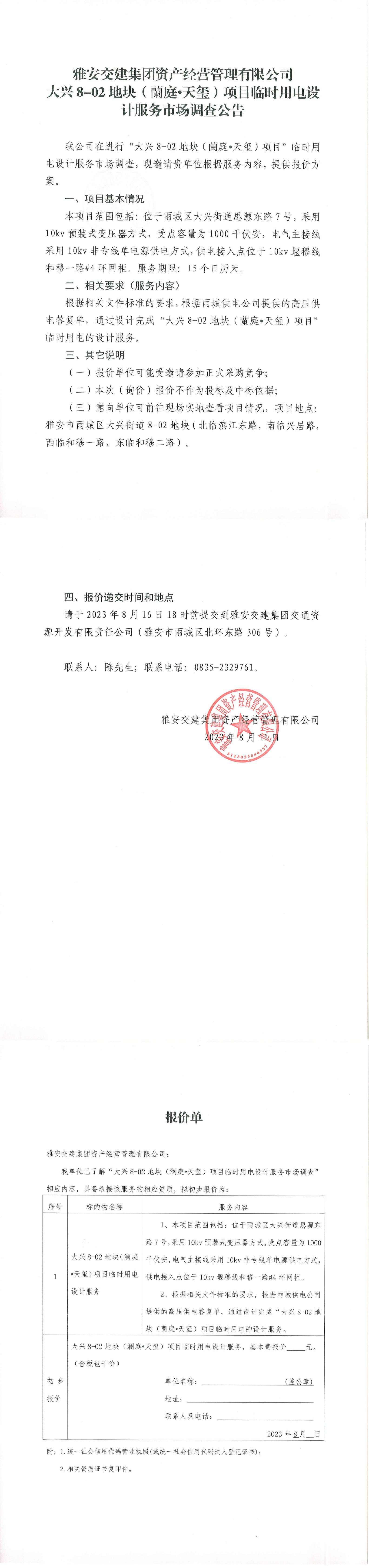 雅安交建集團(tuán)資產(chǎn)經(jīng)營(yíng)管理有限公司大興8-02地塊(蘭庭·天璽)項(xiàng)目臨時(shí)用電設(shè)計(jì)服務(wù)市場(chǎng)調(diào)查公告