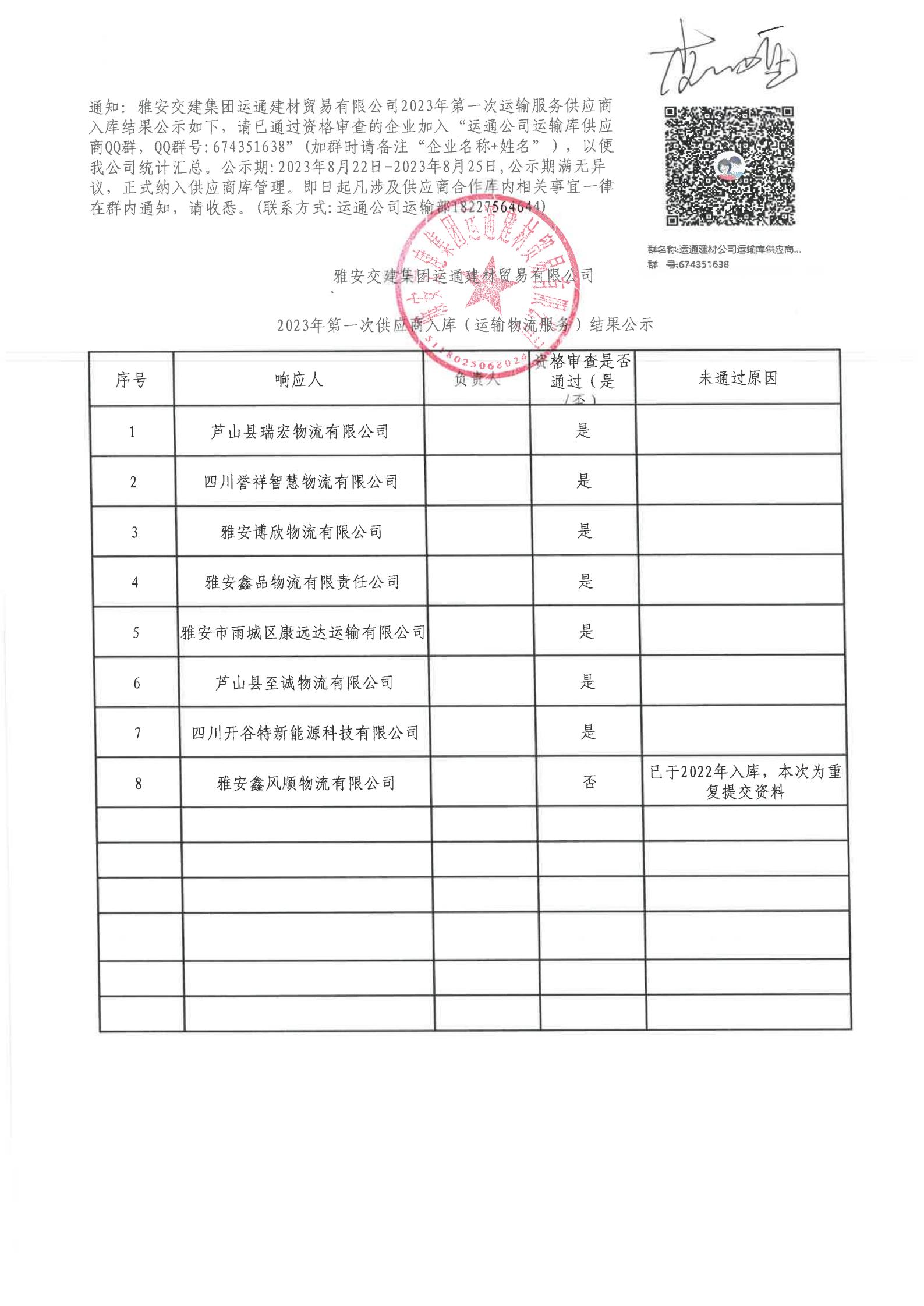 雅安交建集團(tuán)運(yùn)通建材貿(mào)易有限公司2023年第一次供應(yīng)商入庫(運(yùn)輸物流服務(wù))結(jié)果公示