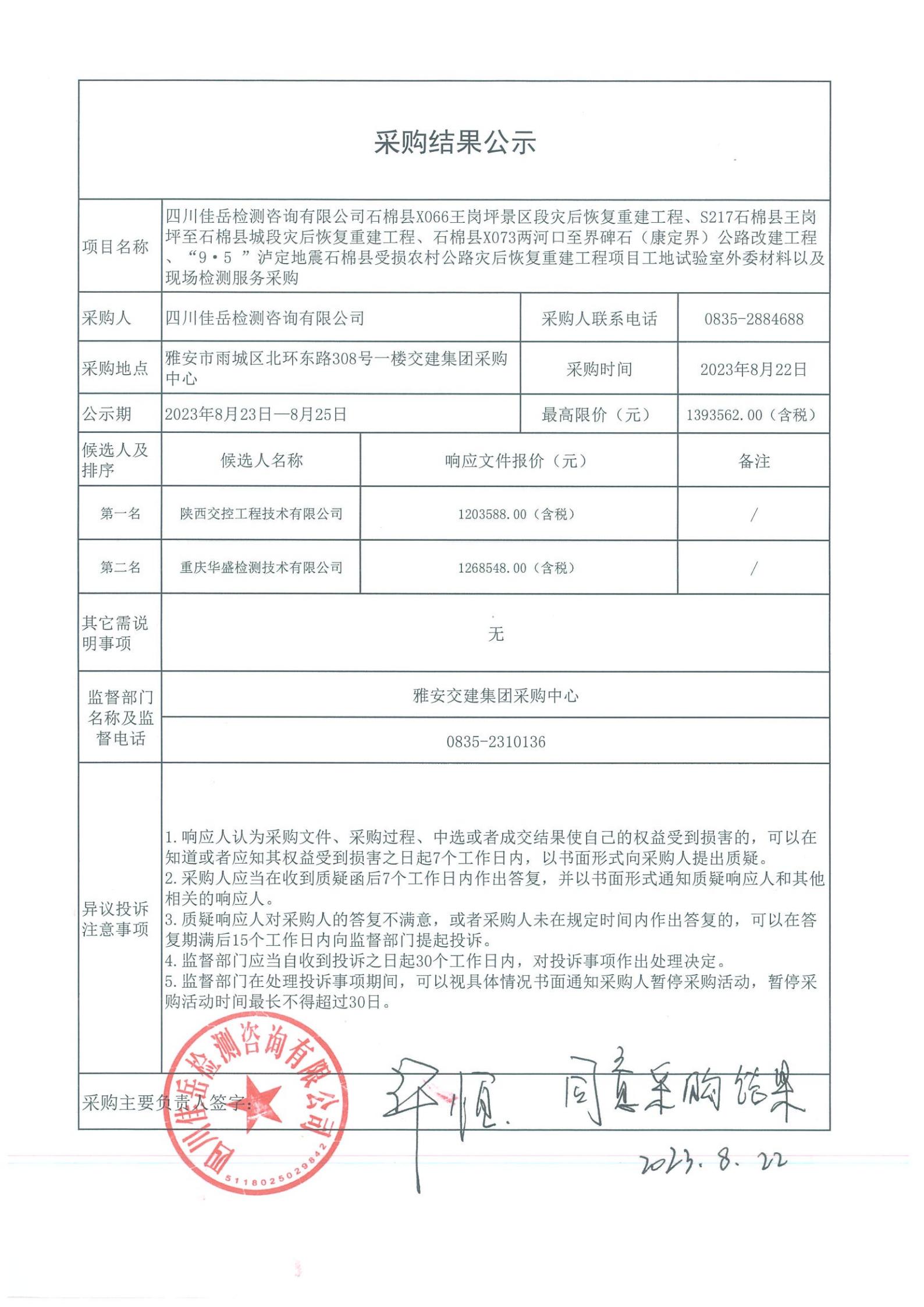 四川佳岳檢測咨詢有限公司石棉縣X066王崗坪至王崗坪景區(qū)段災(zāi)后恢復重建工程、S217石棉縣王崗坪至石棉縣城段災(zāi)后恢復重建工程、石棉縣X073兩河口至界碑石(康定界)公路改建工程、“9·5”瀘定地震石棉縣受損農(nóng)村公路災(zāi)后恢復重建工程項目外委材料以及現(xiàn)場檢測試驗檢測服務(wù)采購庫內(nèi)競價結(jié)果公示
