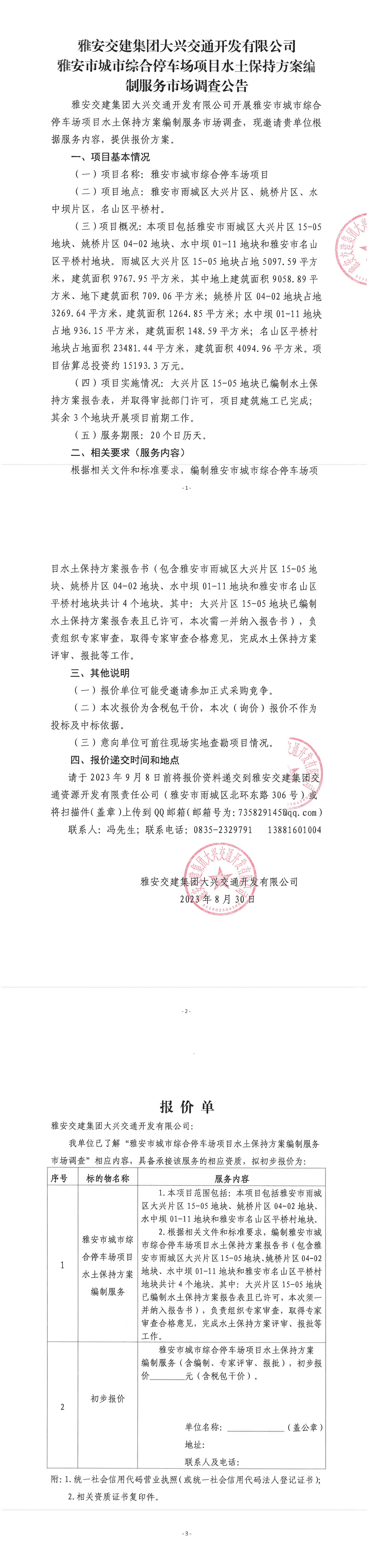 雅安交建集團(tuán)大興交通開發(fā)有限公司雅安市城市綜合停車場(chǎng)項(xiàng)目水土保持方案編制服務(wù)市場(chǎng)調(diào)查公告