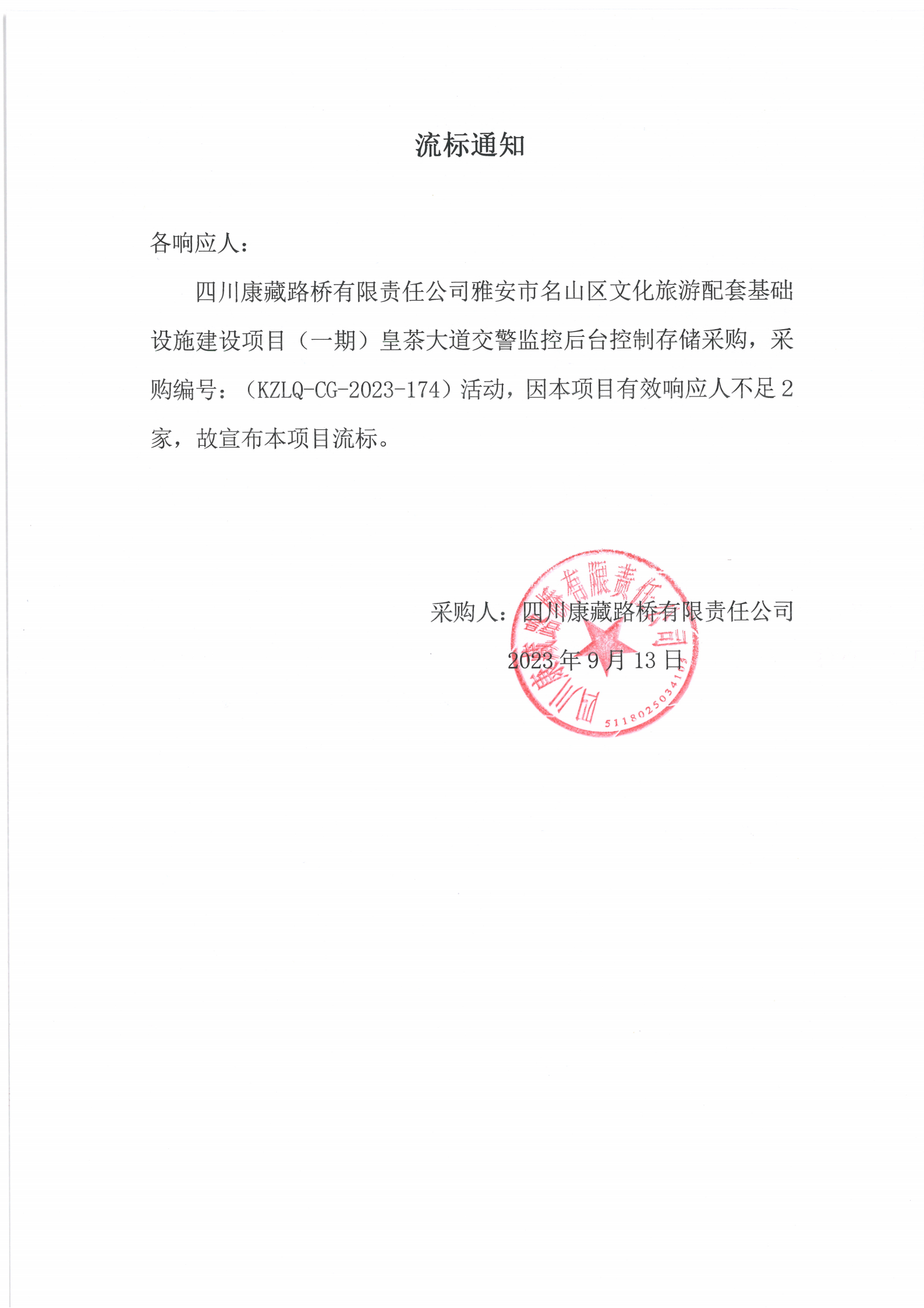 四川康藏路橋有限責(zé)任公司雅安市名山區(qū)文化旅游配套基礎(chǔ)設(shè)施建設(shè)項(xiàng)目(一期)皇茶大道交警監(jiān)控后臺控制存儲采購流標(biāo)通知