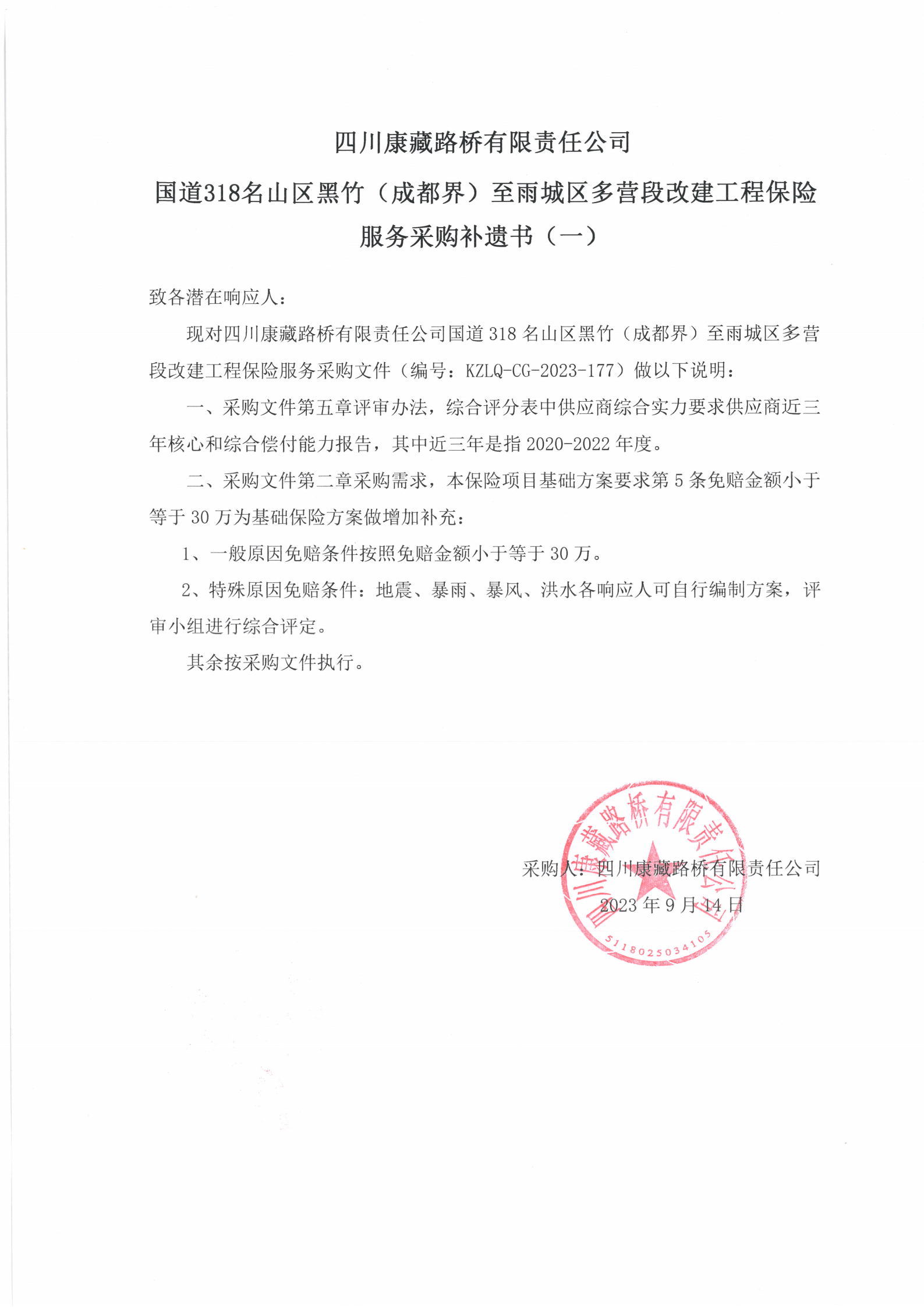 四川康藏路橋有限責任公司國道318名山區(qū)黑竹(成都界)至雨城區(qū)多營段改建工程保險服務(wù)采購補遺書(一)
