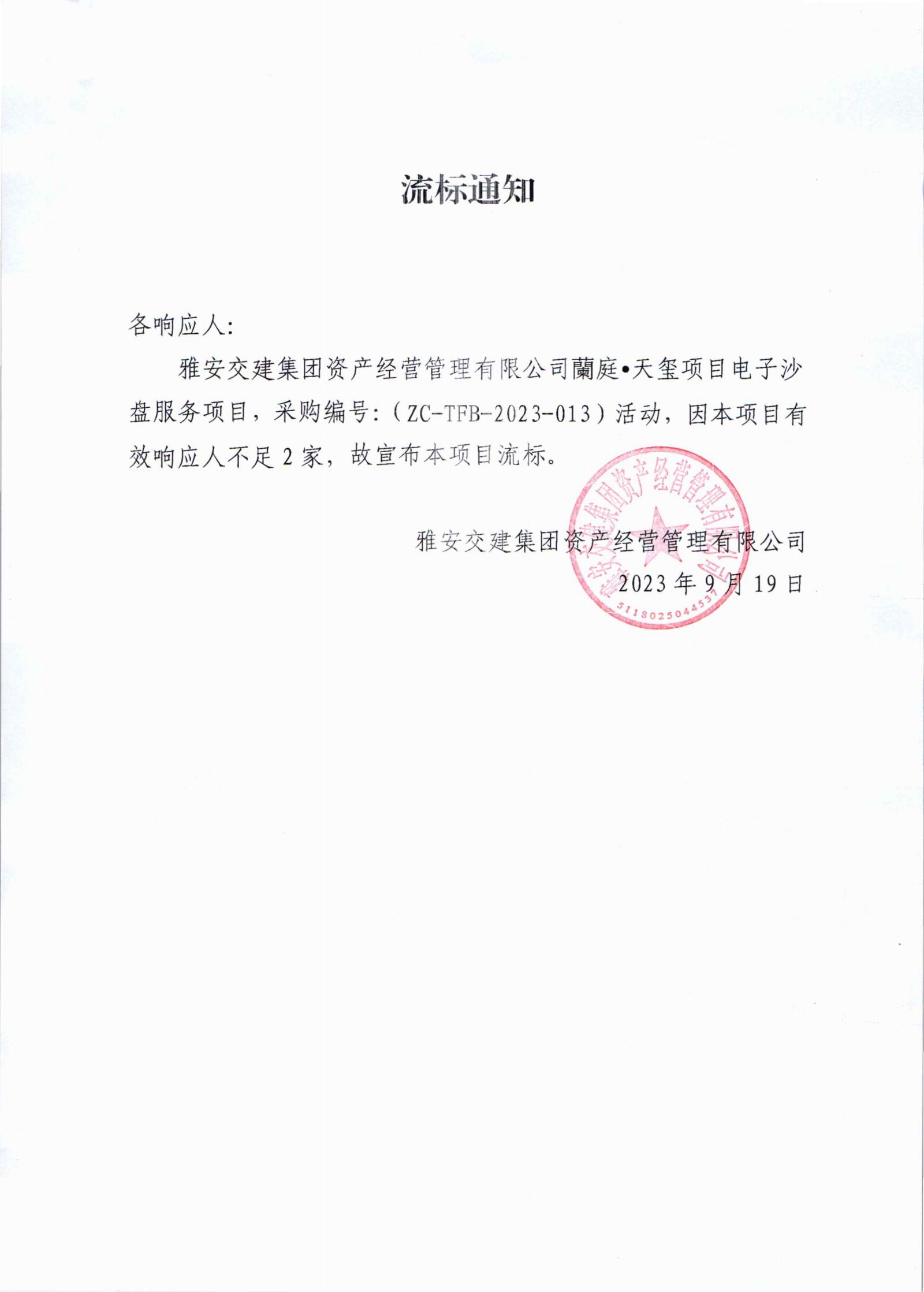 雅安交建集團(tuán)資產(chǎn)經(jīng)營(yíng)管理有限公司蘭庭•天璽項(xiàng)目電子沙盤服務(wù)項(xiàng)目流標(biāo)通知書