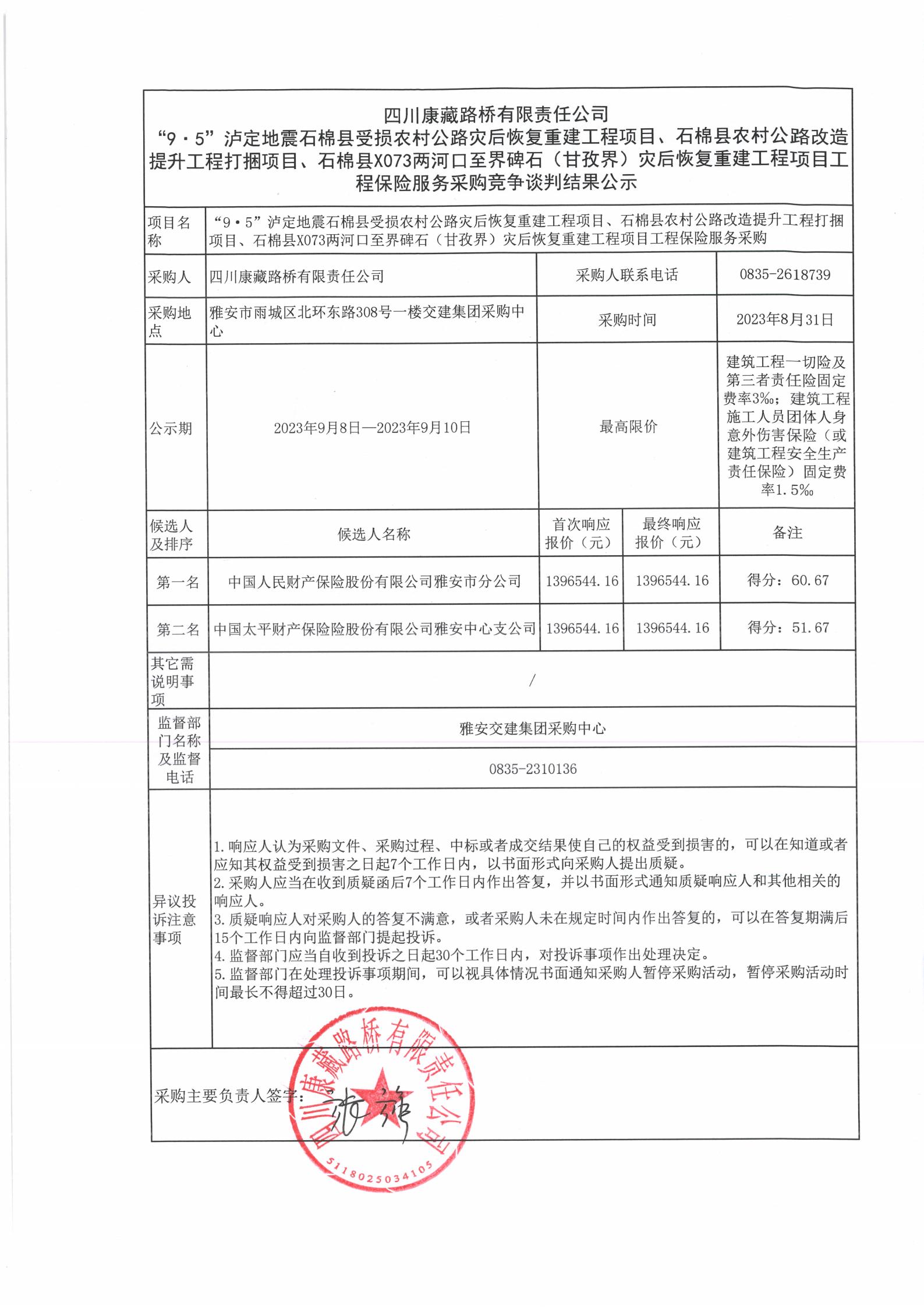 四川康藏路橋有限責任公司“9·5”瀘定地震石棉縣農村公路災后恢復重建工程項目、石棉縣農村公路改造提升工程打捆項目、石棉縣X073兩河口至界碑石(甘孜界)災后恢復重建工程項目工程保險服務采購競爭談判結果公示