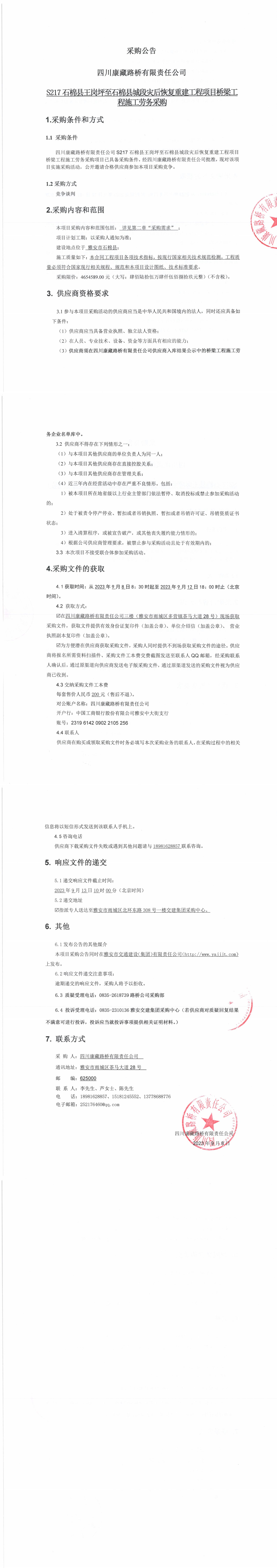 四川康藏路橋有限責任公司S217石棉縣王崗坪至石棉縣城段災(zāi)后恢復(fù)重建工程項目橋梁工程施工勞務(wù)采購公告