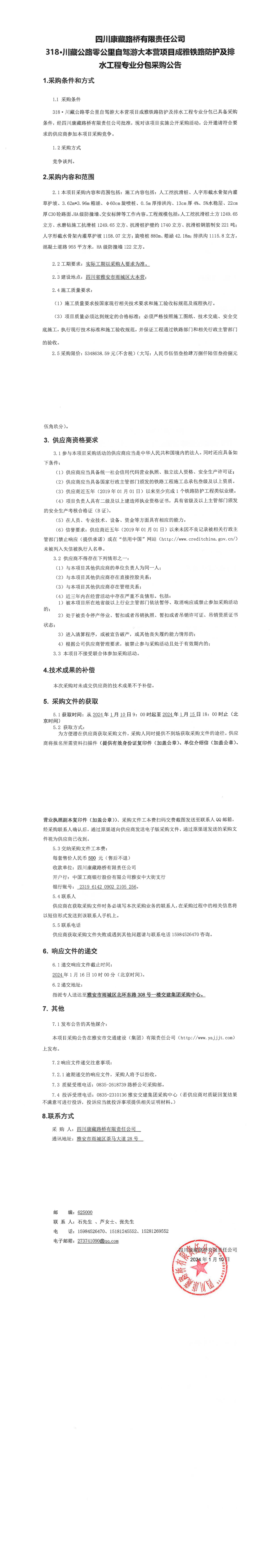 四川康藏路橋有限責(zé)任公司318·川藏公路零公里自駕游大本營項目成雅鐵路防護及排水工程專業(yè)分包采購公告