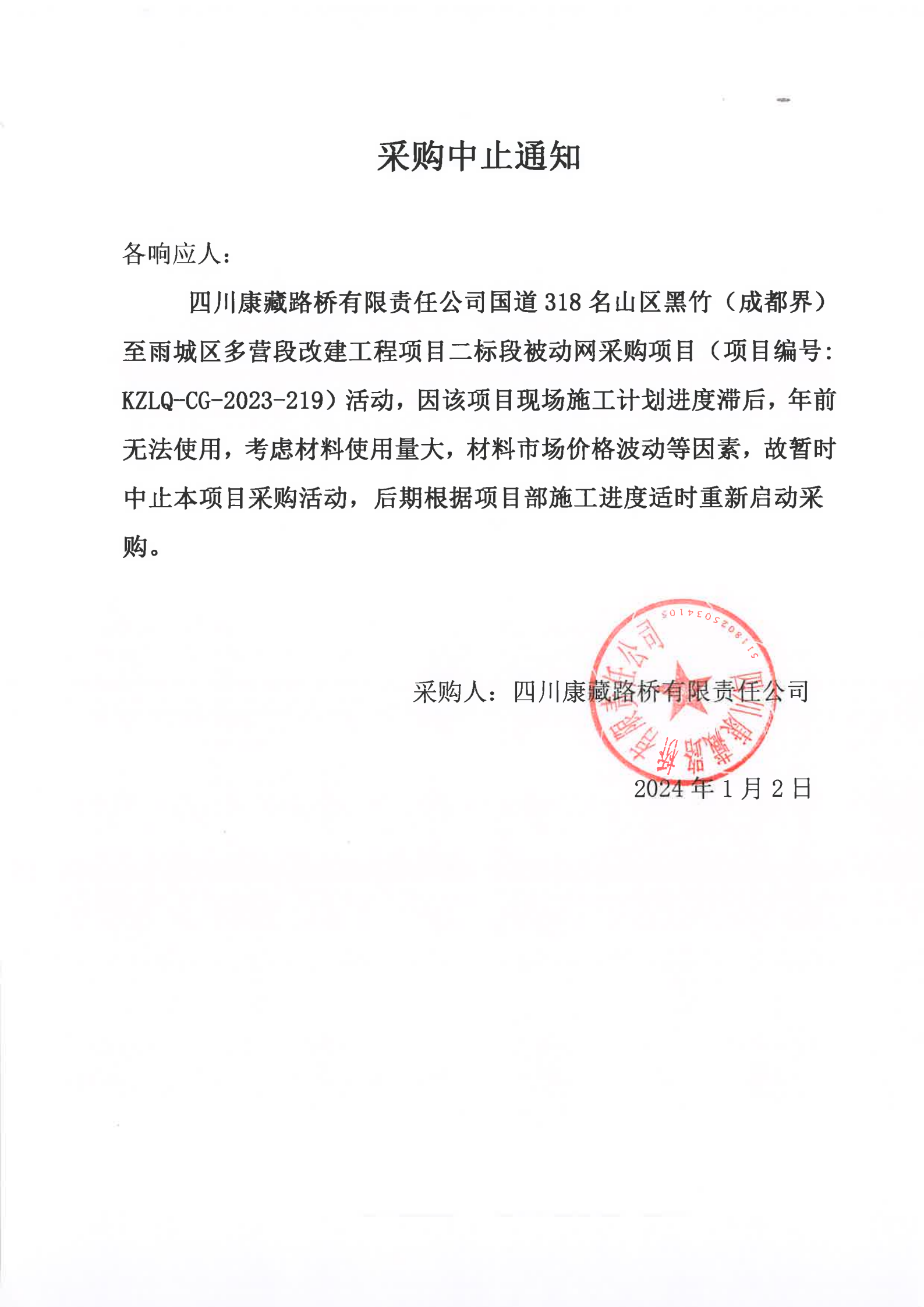 四川康藏路橋有限責(zé)任公司國道318名山區(qū)黑竹(成都界)至雨城區(qū)多營段改建工程項(xiàng)目二標(biāo)段被動網(wǎng)采購項(xiàng)目采購中止通知
