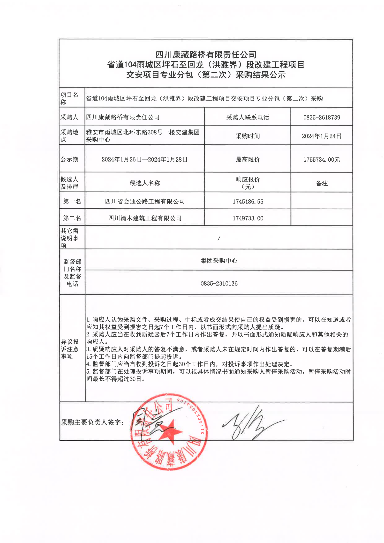 四川康藏路橋有限責(zé)任公司省道104雨城區(qū)坪石至回龍(洪雅界)段改建工程項(xiàng)目交安項(xiàng)目專業(yè)分包(第二次)采購結(jié)果公示