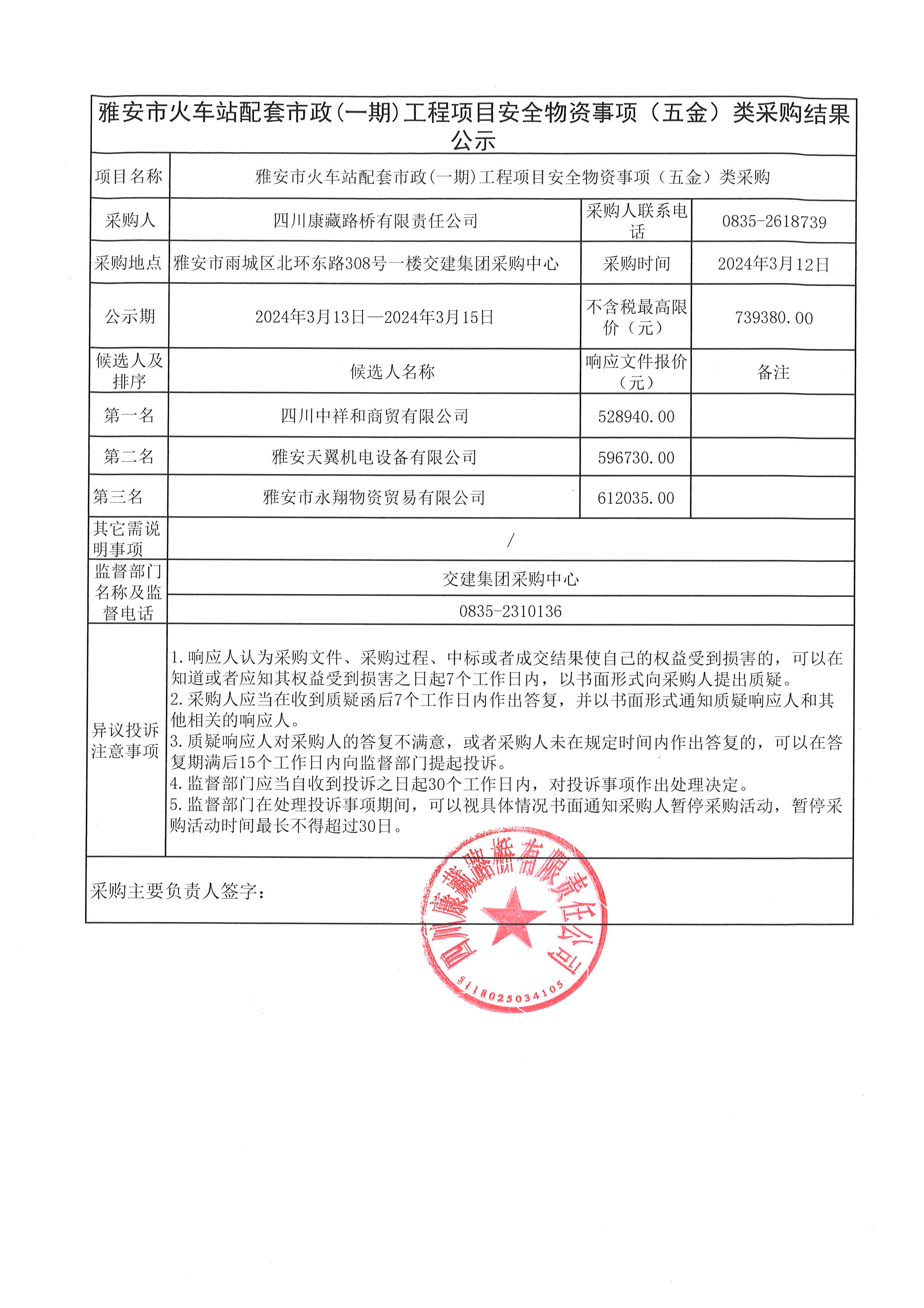 四川康藏路橋有限責任公司雅安市火車站配套市政(一期)工程項目安全物資(五金)采購結(jié)果公示