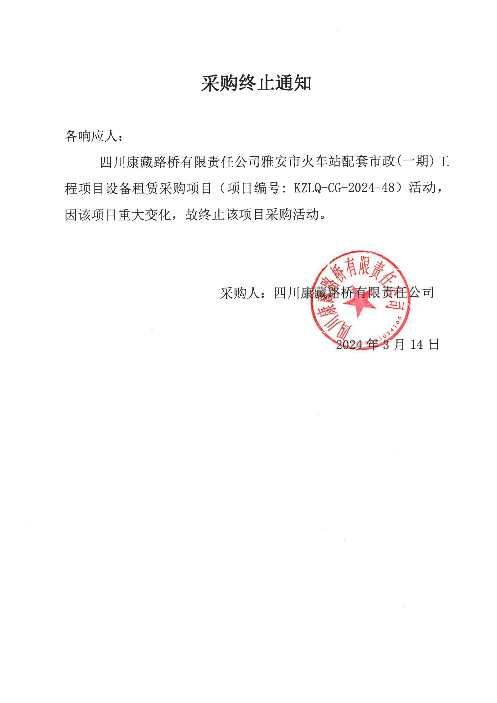 四川康藏路橋有限責任公司雅安市火車站配套市政(一期)工程項目設備租賃采購終止通知