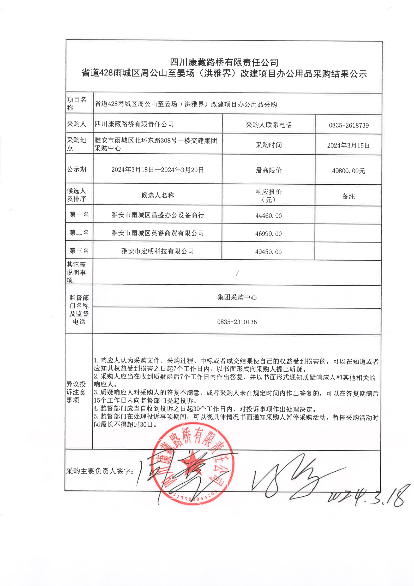 四川康藏路橋有限責任公司省道428雨城區(qū)周公山至晏場(洪雅界)改建項目辦公用品(第二次)采購結(jié)果公示