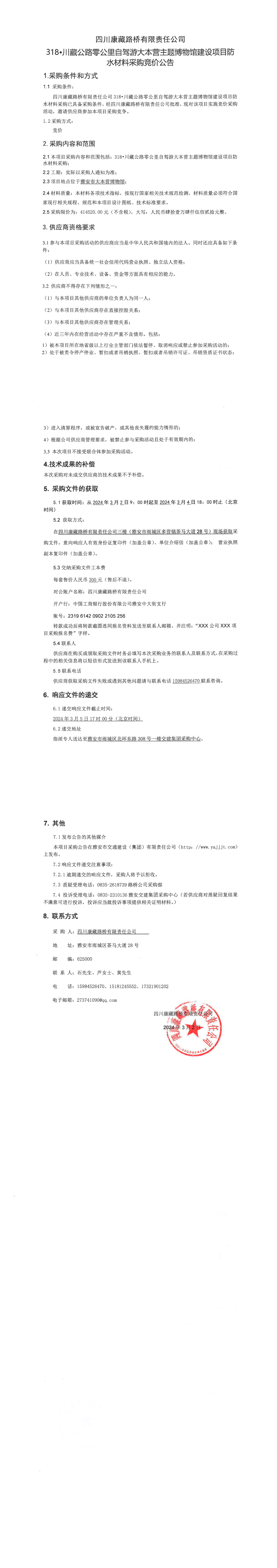 四川康藏路橋有限責(zé)任公司318·川藏公路零公里自駕游大本營(yíng)主題博物館建設(shè)項(xiàng)目防水材料采購(gòu)競(jìng)價(jià)公告