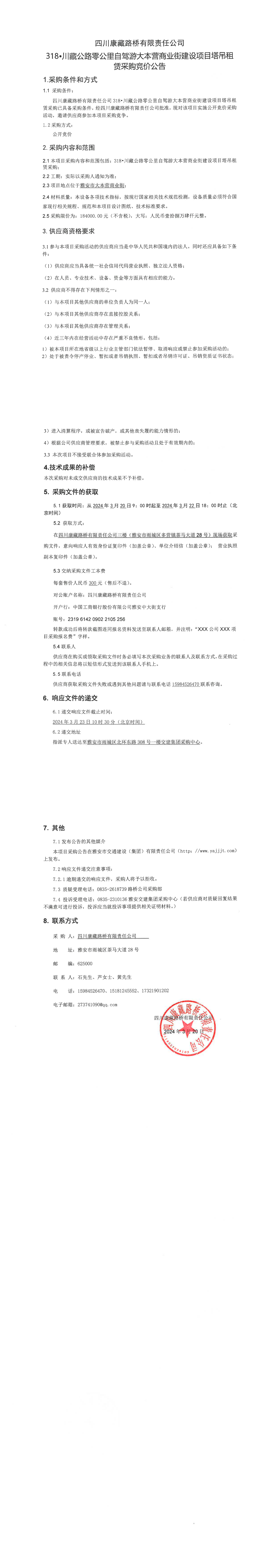 四川康藏路橋有限責(zé)任公司318·川藏公路零公里自駕游大本營(yíng)商業(yè)街建設(shè)項(xiàng)目塔吊租賃采購(gòu)競(jìng)價(jià)公告