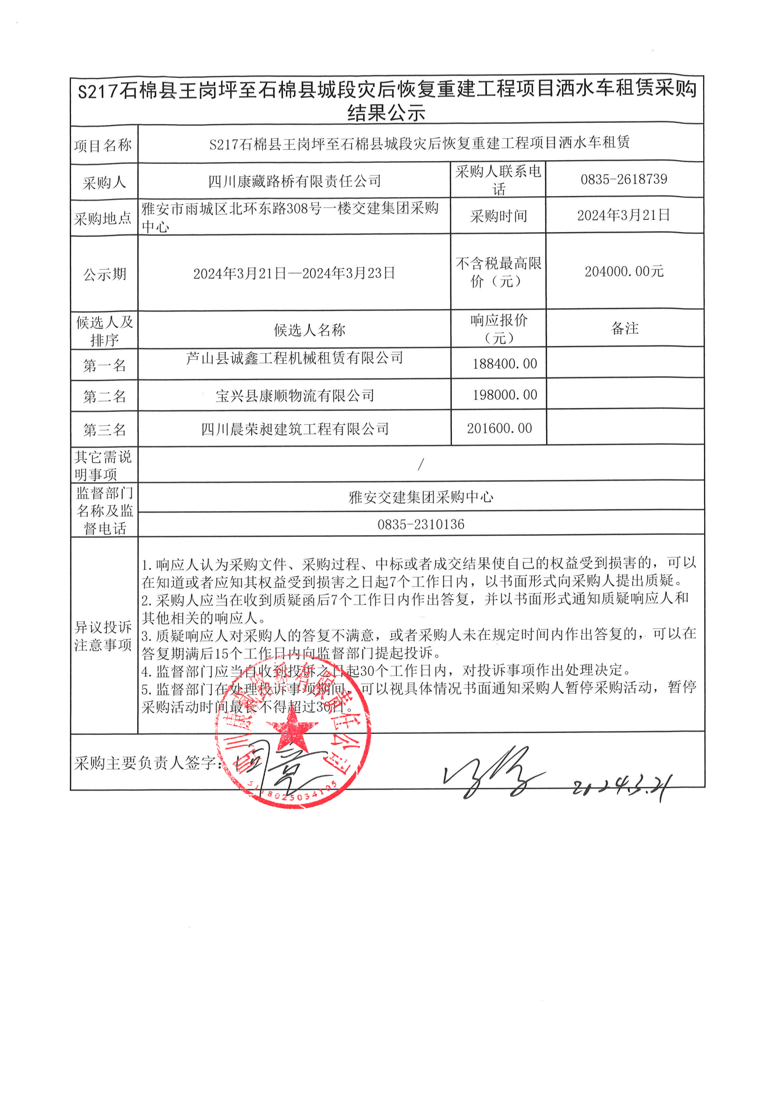 四川康藏路橋有限責(zé)任公司S217石棉縣王崗坪至石棉縣城段災(zāi)后恢復(fù)重建工程項目灑水車租賃采購結(jié)果公示