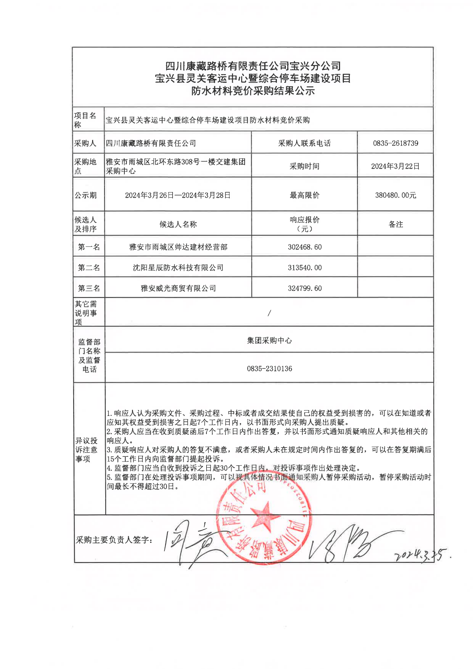 四川康藏路橋有限責(zé)任公司寶興縣靈關(guān)客運(yùn)中心暨綜合停車場建設(shè)項(xiàng)目防水材料競價采購結(jié)果公示
