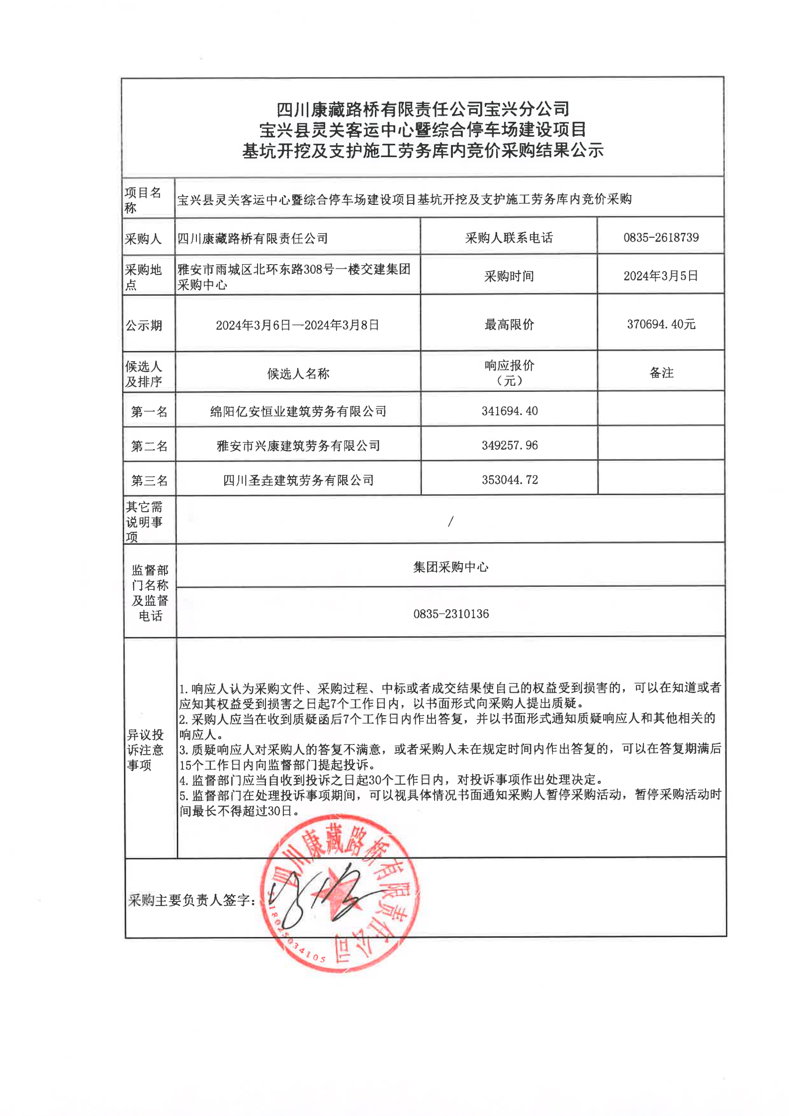 四川康藏路橋有限責(zé)任公司寶興分公司寶興縣靈關(guān)客運(yùn)中心暨綜合停車場(chǎng)建設(shè)項(xiàng)目基坑開挖及支護(hù)施工勞務(wù)庫(kù)內(nèi)競(jìng)價(jià)采購(gòu)結(jié)果公示