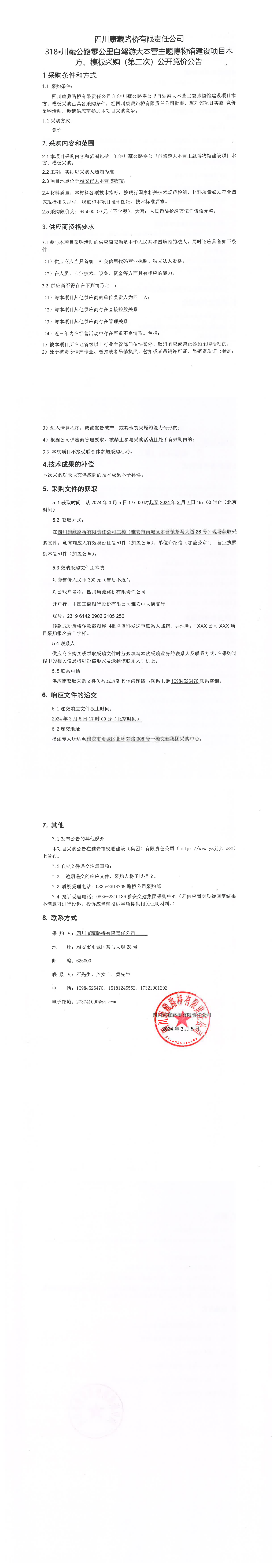 四川康藏路橋有限責(zé)任公司318·川藏公路零公里自駕游大本營主題博物館建設(shè)項目木方、模板采購(第二次)公開競價公告
